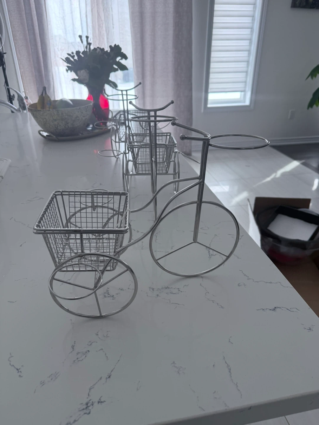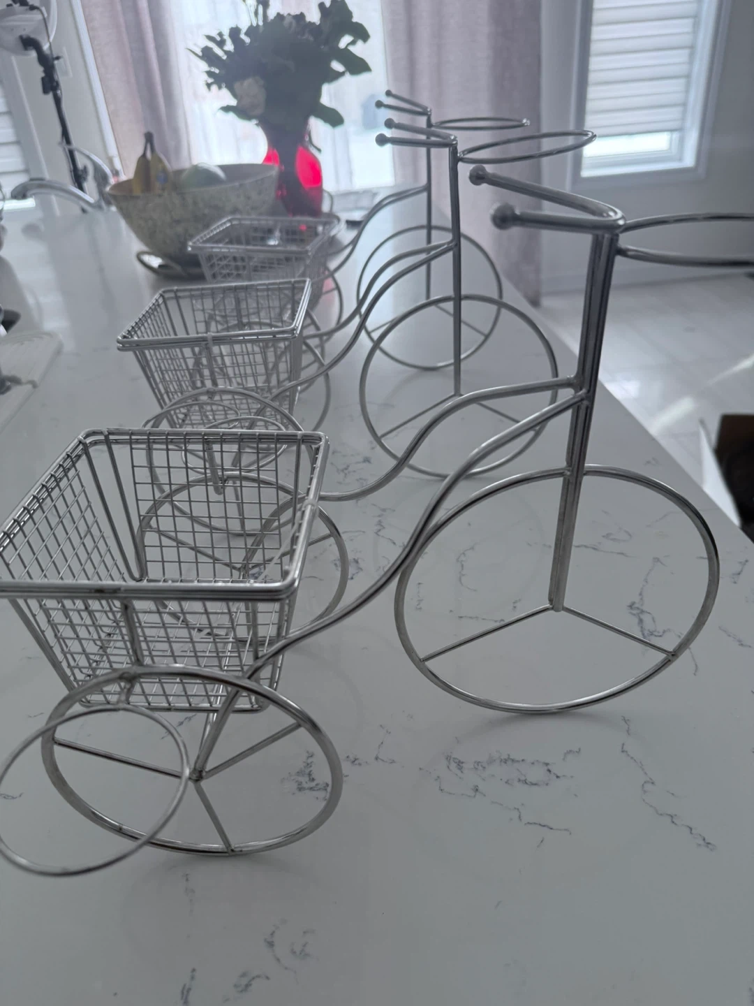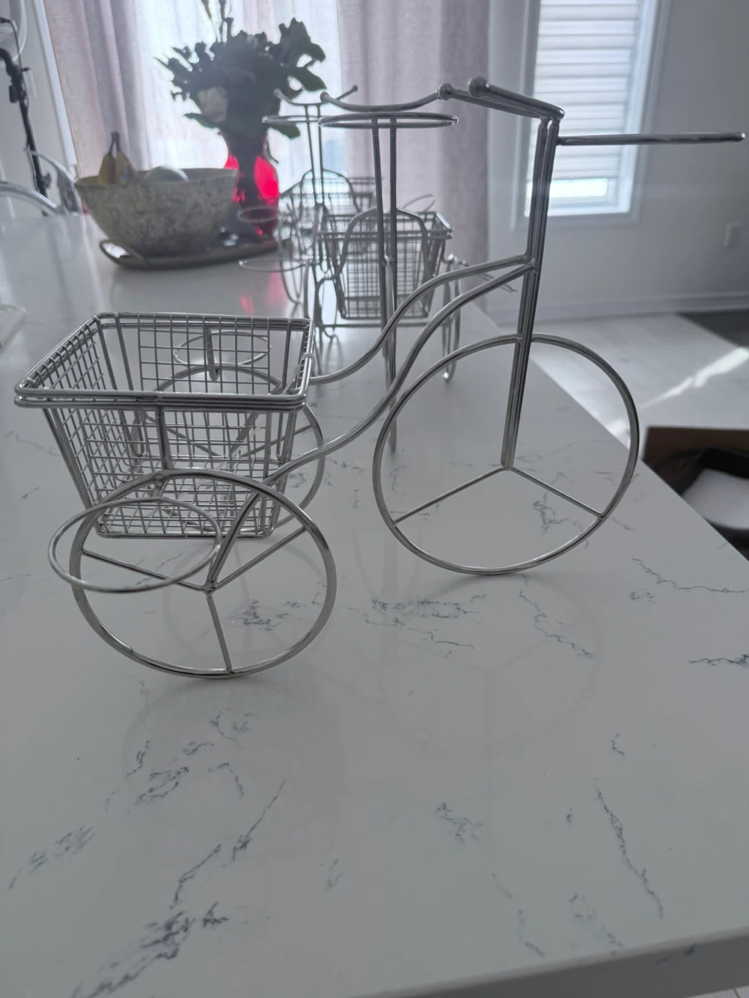 This decorative metal bicycle holder features a charming tricycle design with wire baskets. It's great for holding small items like mail, keys, or candies. The silver metal finish adds a touch of elegance to any countertop or shelf.