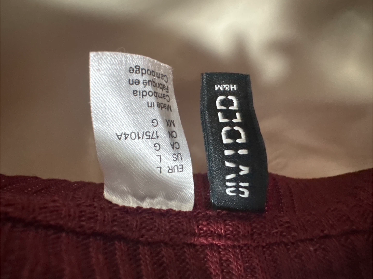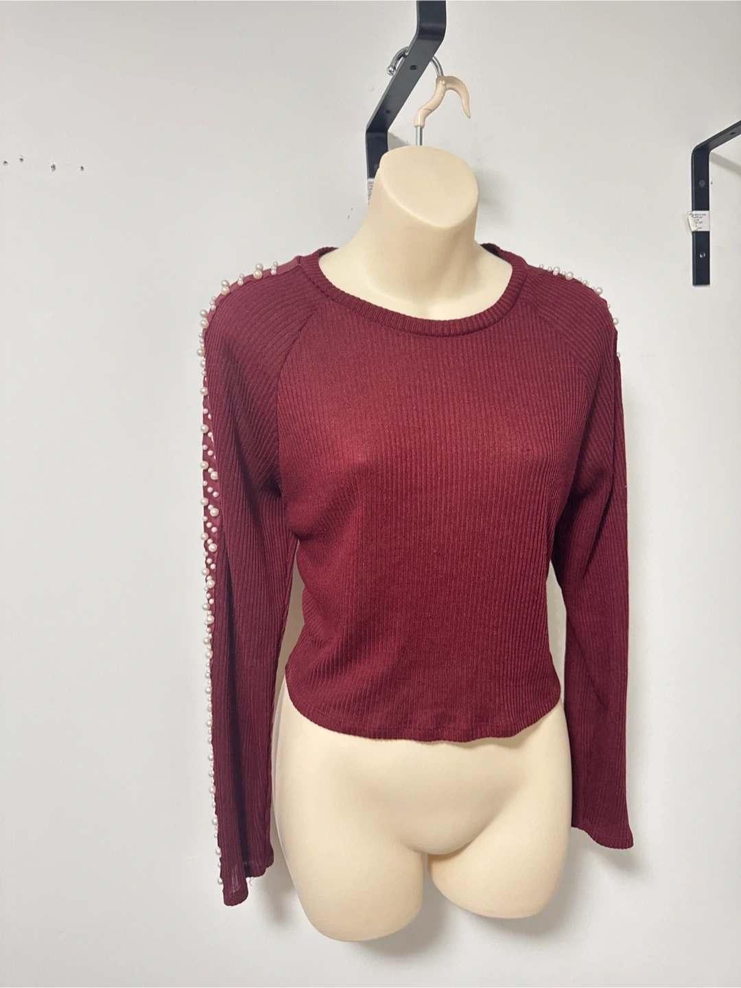 It's a burgundy ribbed crop top with pearl embellishments on the sleeves. Made in Cambodia. Size is large.