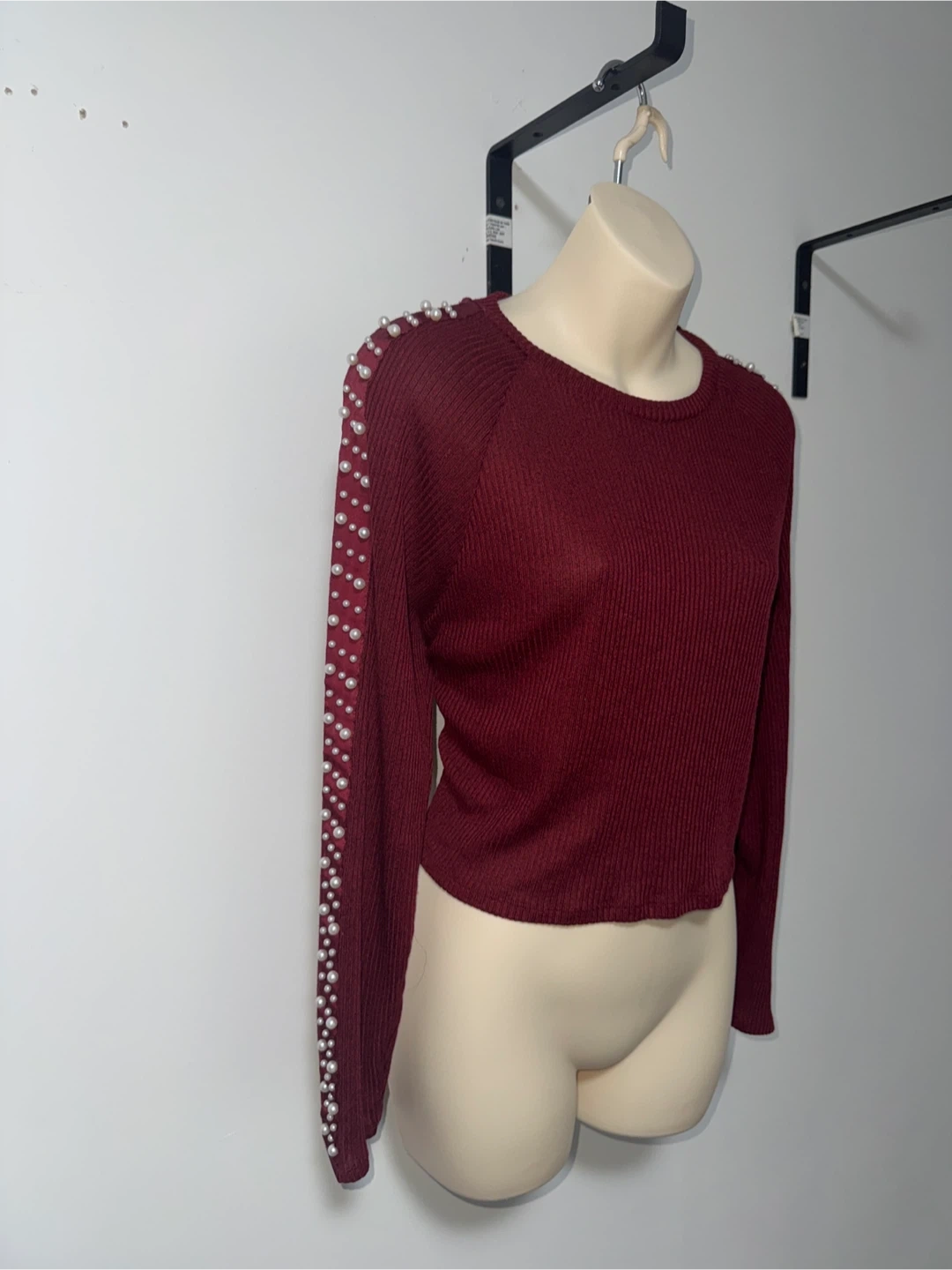 Divided H&M Burgundy Ribbed Pearl Sleeve Crop Top - Size L