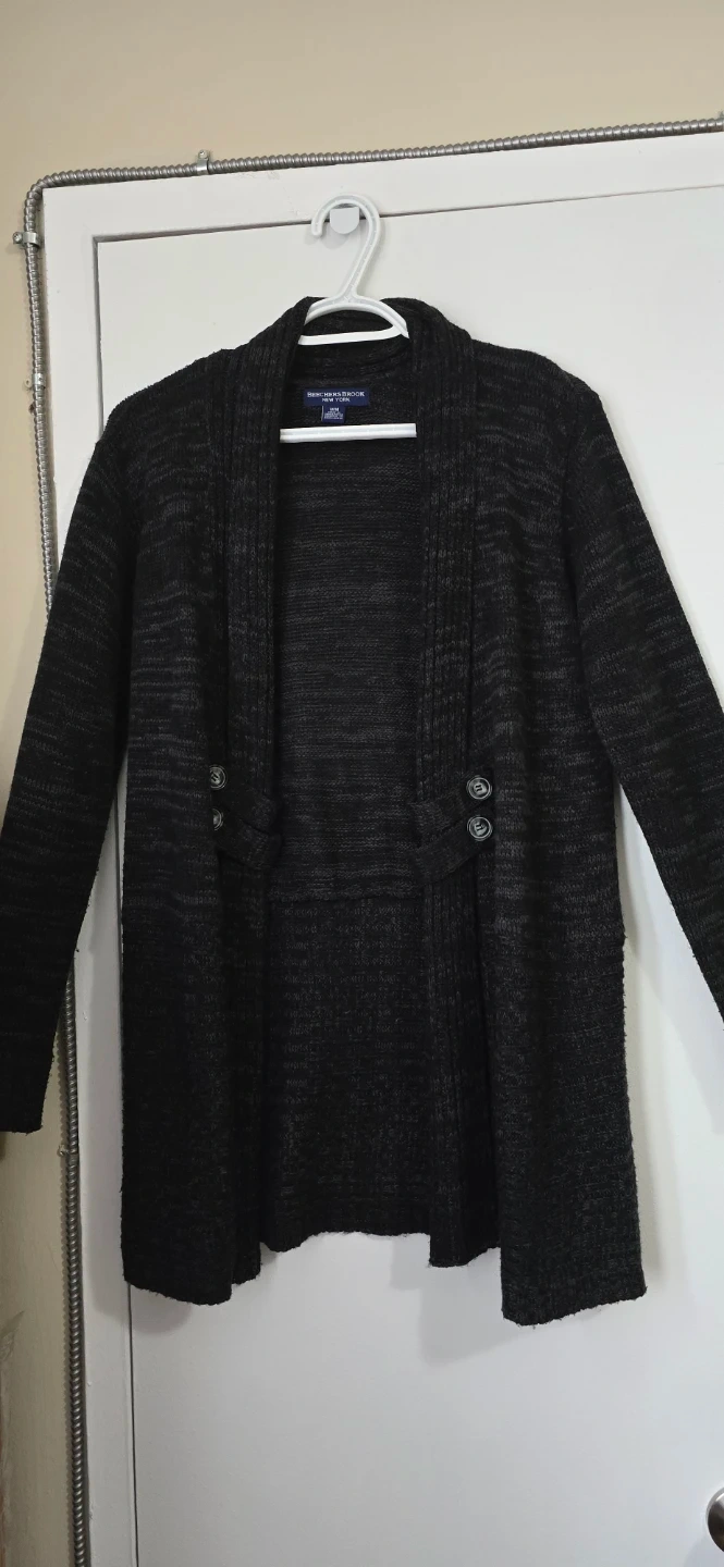 This is a dark grey marled knit cardigan from Beechers Brook New York. It features a shawl collar and decorative buttons at the waist. M/M size.