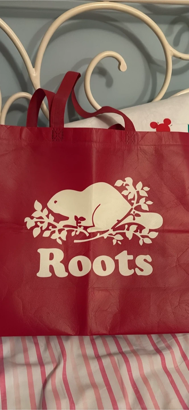 This is a red reusable shopping bag from Roots. It features the classic Roots beaver logo in white. The bag is made of durable material, perfect for carrying groceries or everyday items.