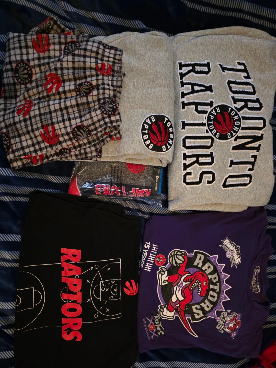 This bundle includes Toronto Raptors branded apparel. There's a pair of plaid pyjama pants with the Raptors logo, a grey hooded sweatshirt, a black t-shirt with a basketball playbook design, and a purple t-shirt celebrating the 15th and 20th seasons. Made for fans!