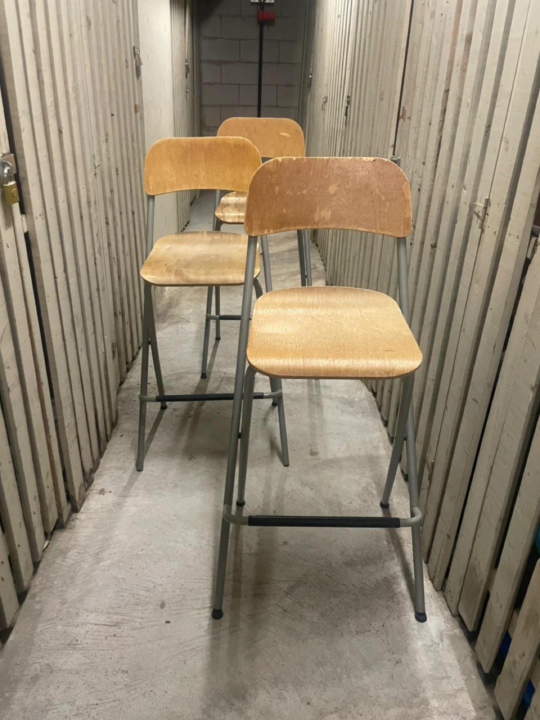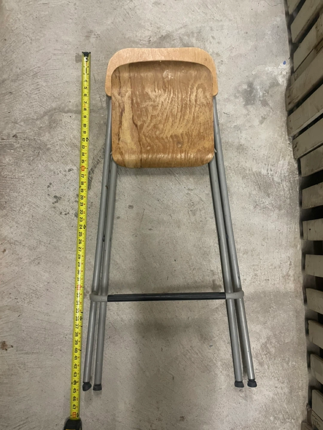 This is a folding stool with a wooden seat and metal frame. It's sturdy and easy to store. The seat is made of wood, and the legs are metal.