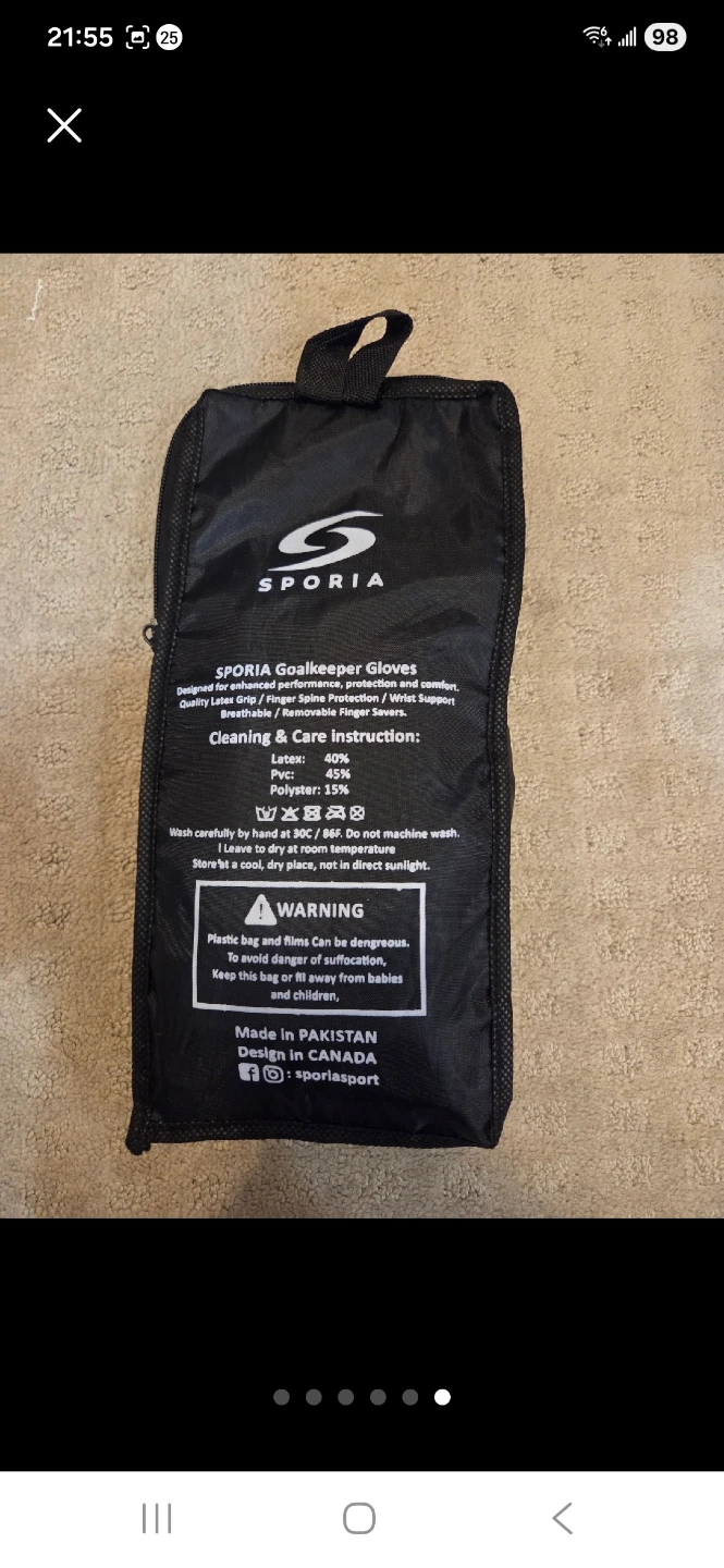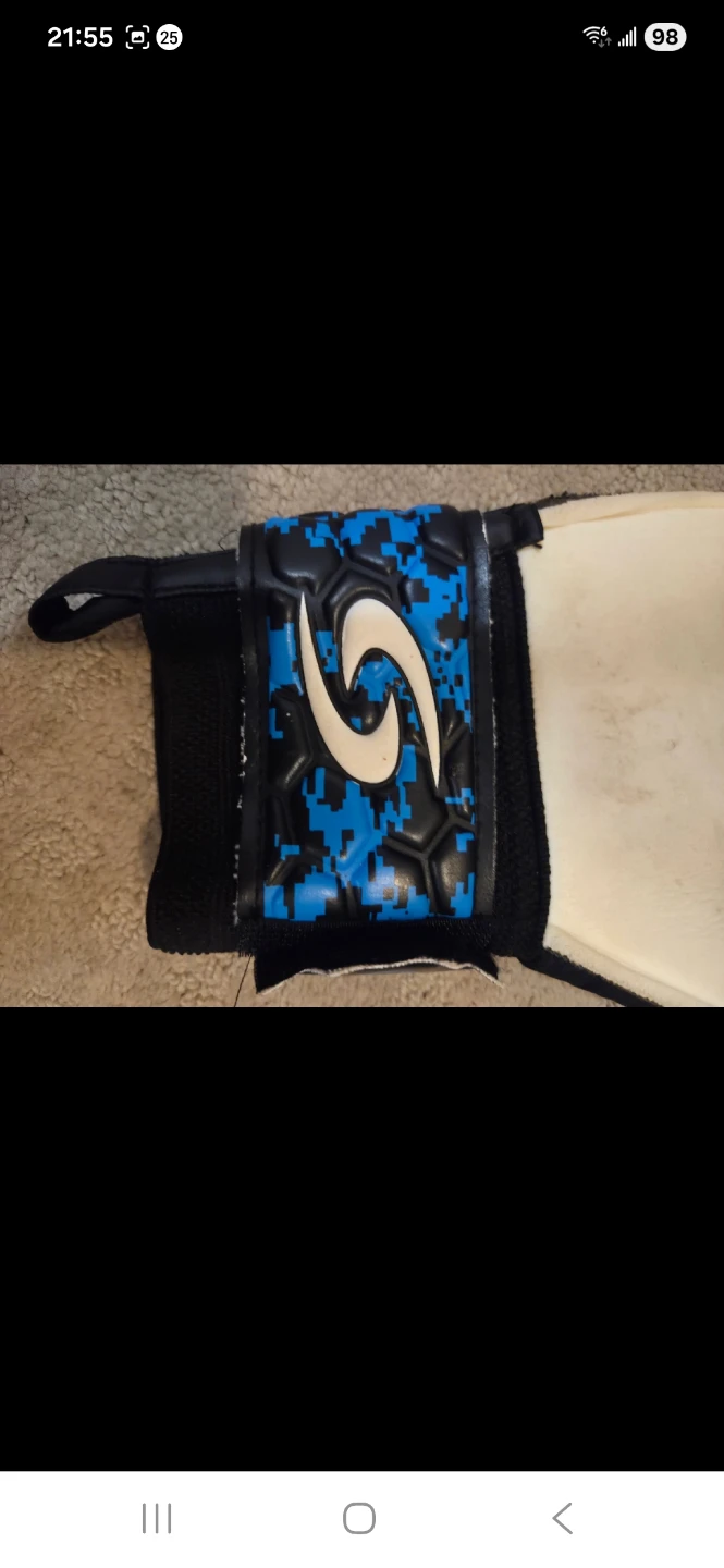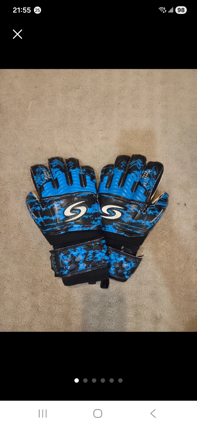 Selling a pair of Sporia Goalkeeper Gloves in blue. They feature punch zone and thumb support. Comes with glove bag. It fits mostly anyone, specifically teenagers. It only has minor scratches on the front but won't affect gameplay. Barely used.