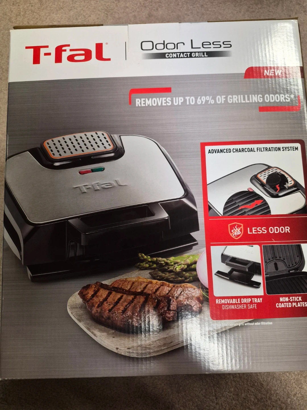 This T-fal contact grill features an advanced charcoal filtration system that removes up to 69% of grilling odours. It has non-stick coated plates and a removable drip tray that's dishwasher safe. It's great for indoor grilling any time of year!