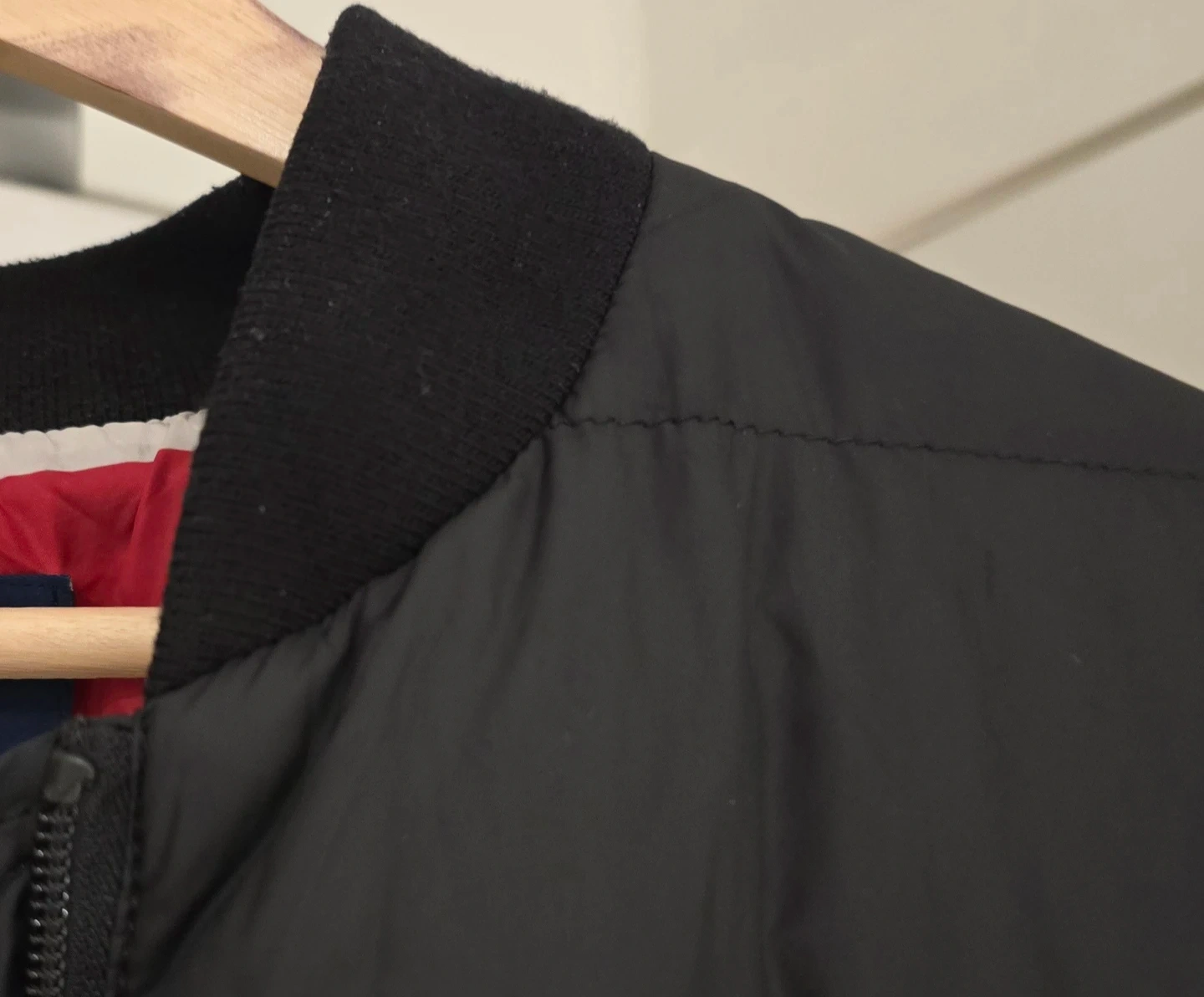 Black puffer jacket with the iconic La Baie d'Hudson stripe lining, cute zipper detail.