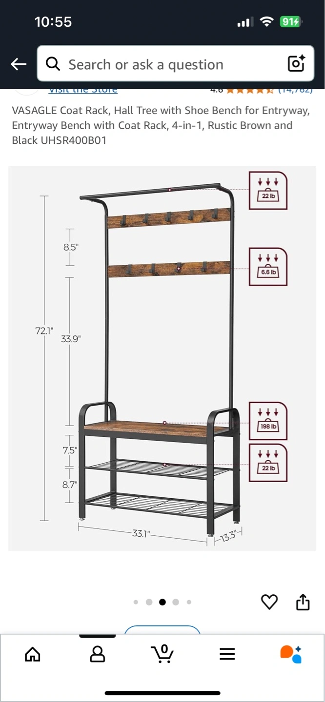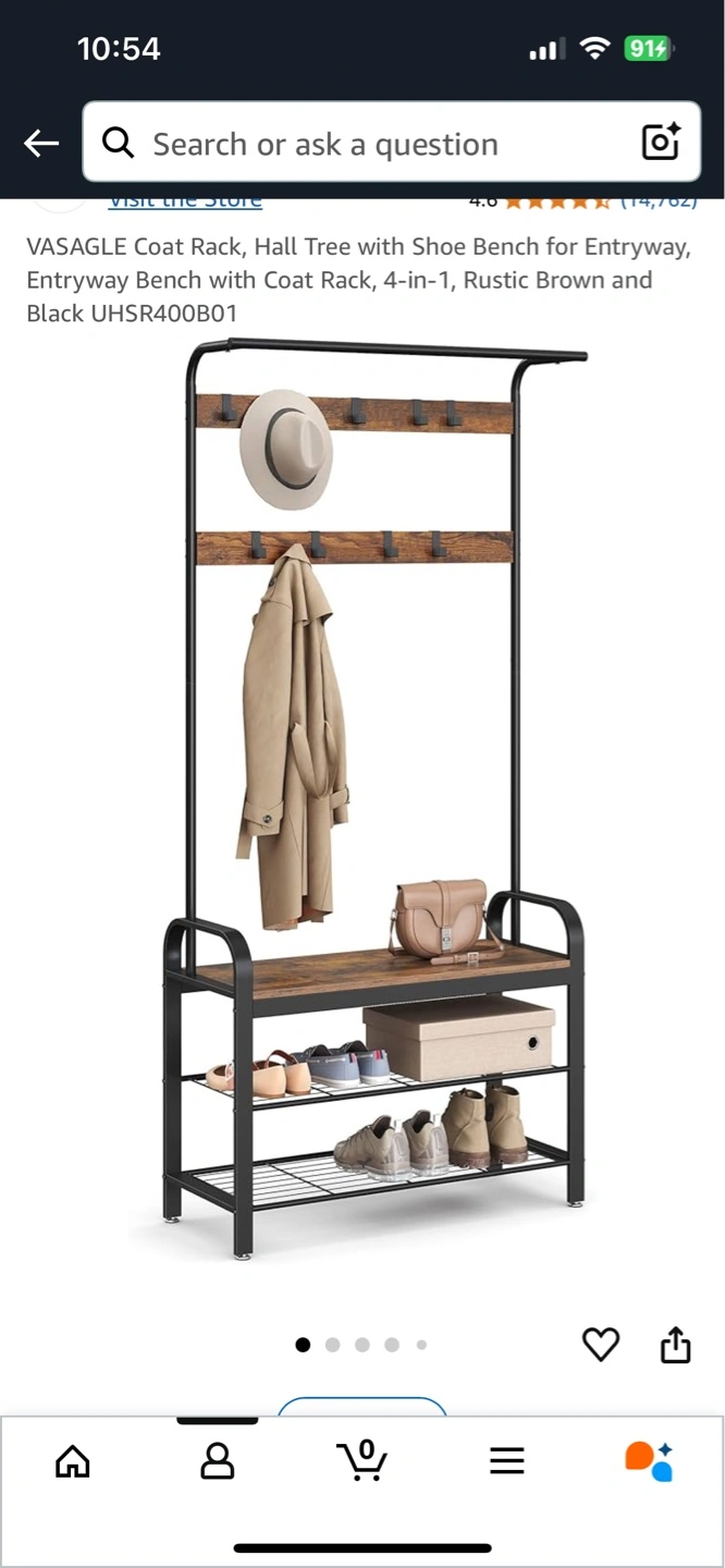 4-in-1 entryway bench with coat rack. Rustic brown and black. Sturdy metal frame. Two-tier shoe rack. Multiple coat hooks. Perfect for entryway organization.