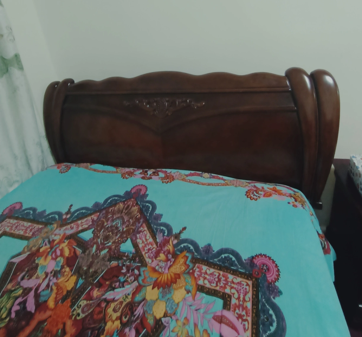 Dark brown wooden bed frame. Queen size. Intricate carvings on the headboard. Includes headboard and footboard. Slight wear and tear expected.