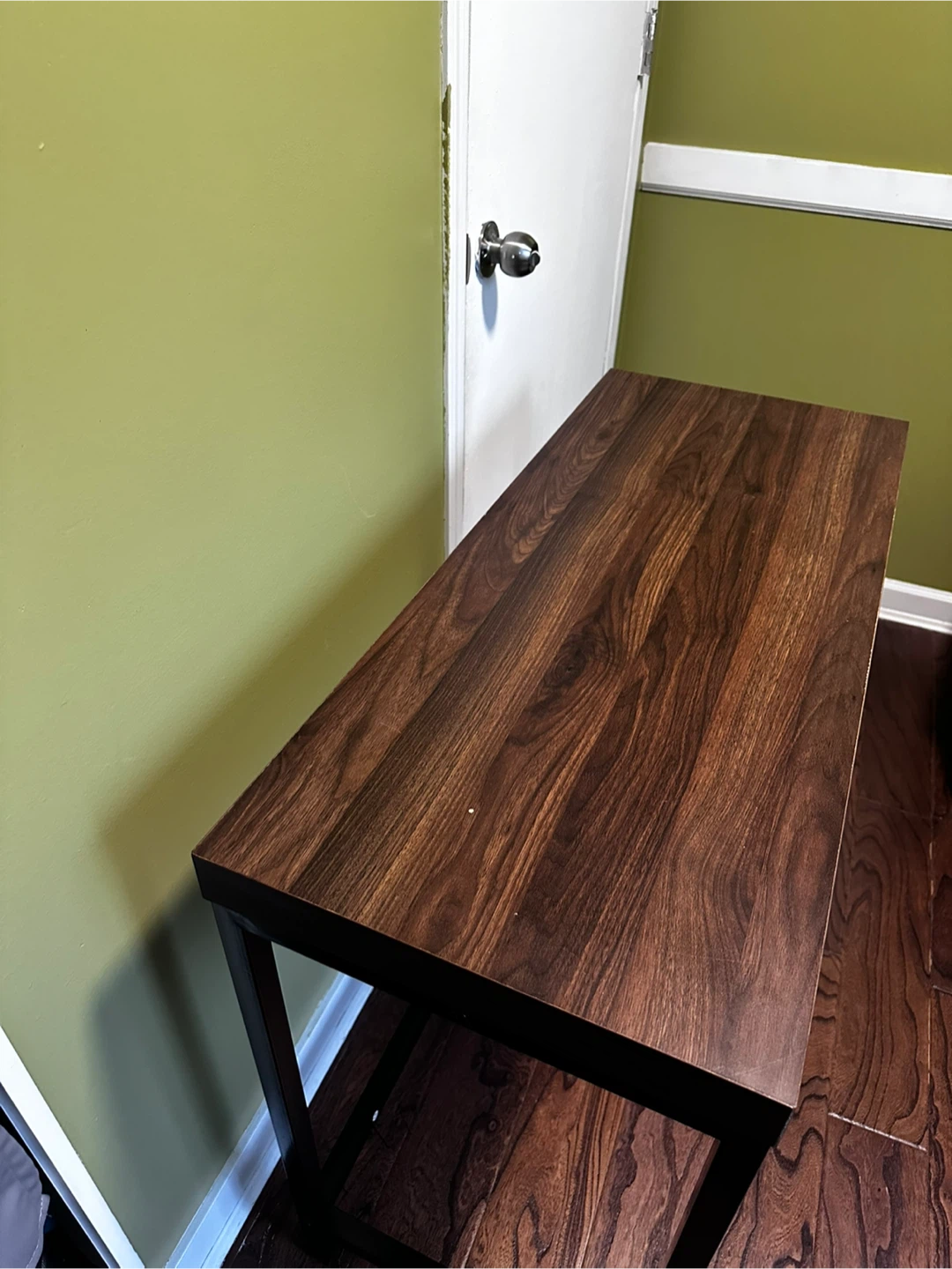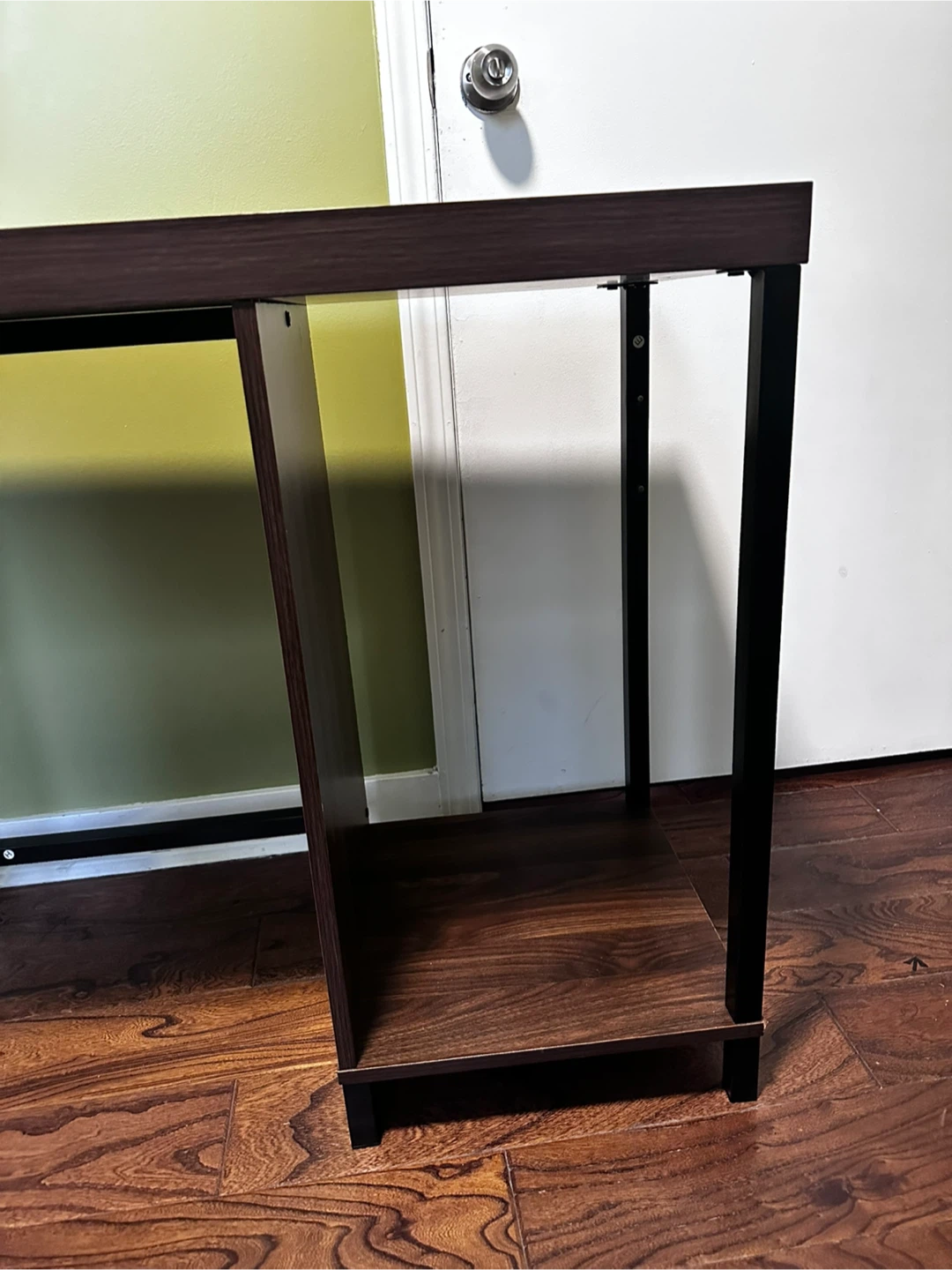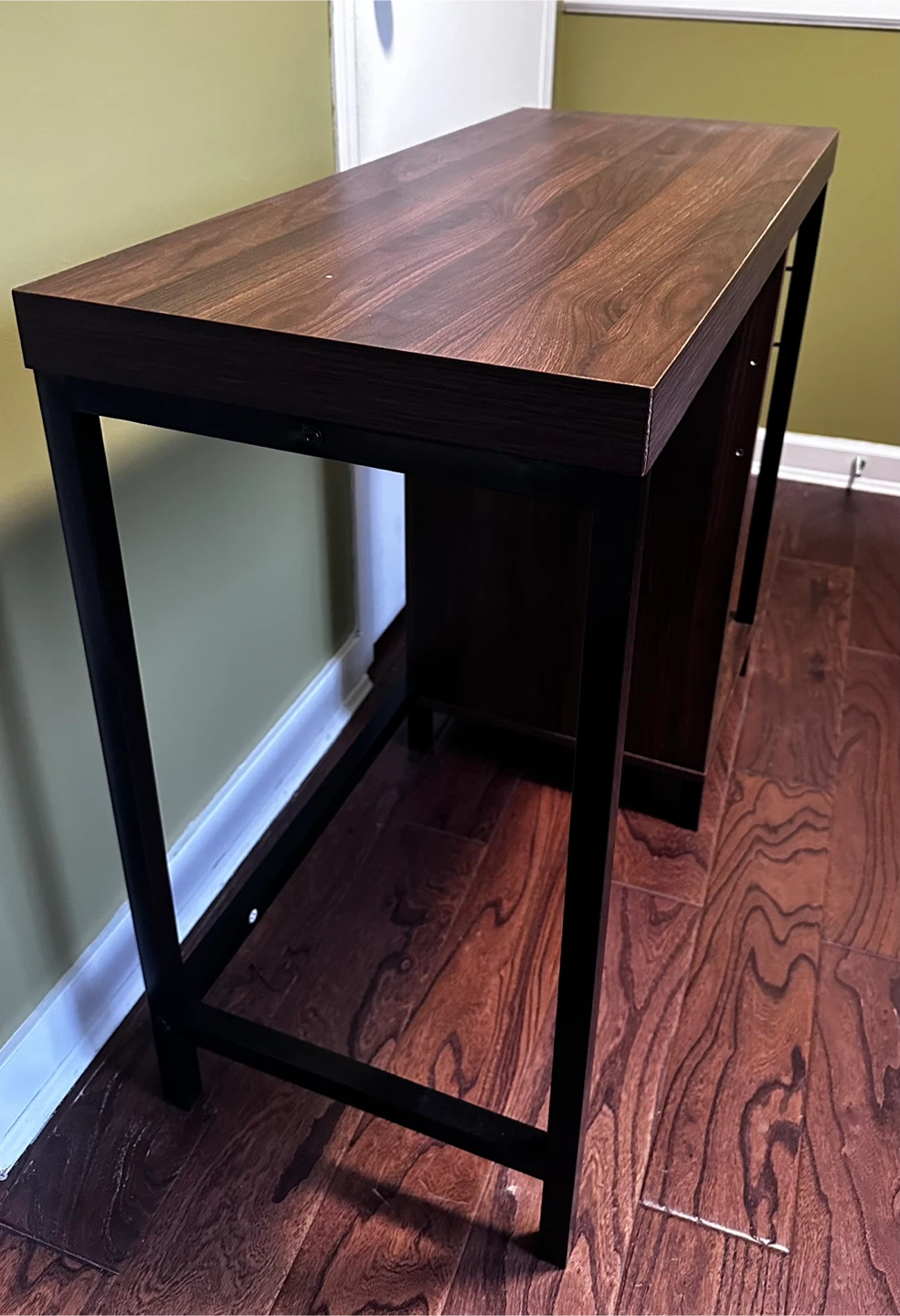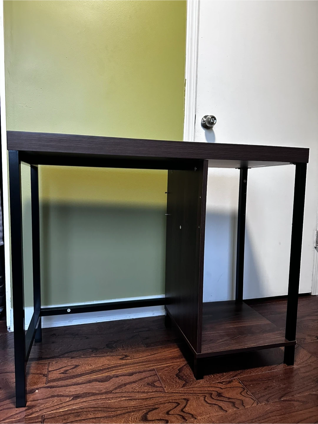 This computer desk has a dark wood-effect tabletop and a sturdy black metal frame. It includes a side shelf for extra storage. Perfect for a small office or study space.