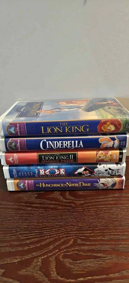 Awesome collection of Disney VHS tapes. Has The Lion King, Cinderella, The Lion King II: Simba's Pride, 101 Dalmatians, and The Hunchback of Notre Dame. Great for movie nights or collecting.