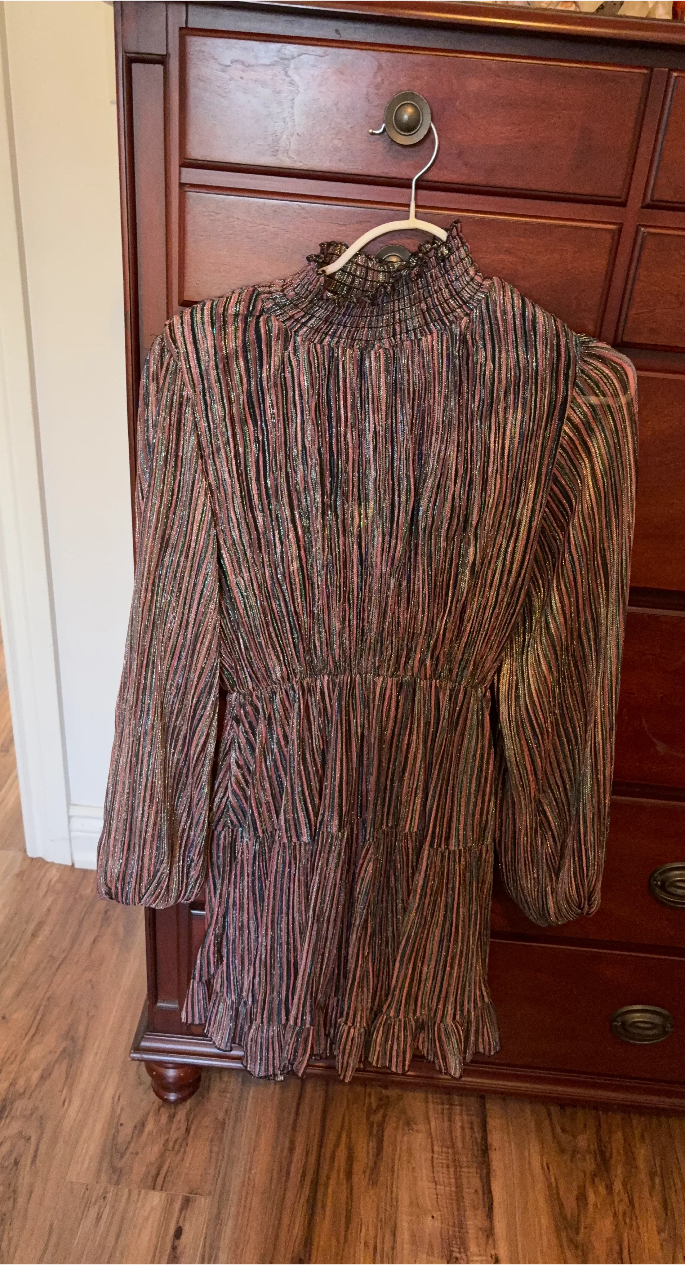 This dress features a fun metallic striped pattern all over. It has a high neckline and long sleeves. The tiered skirt adds a bit of flair!