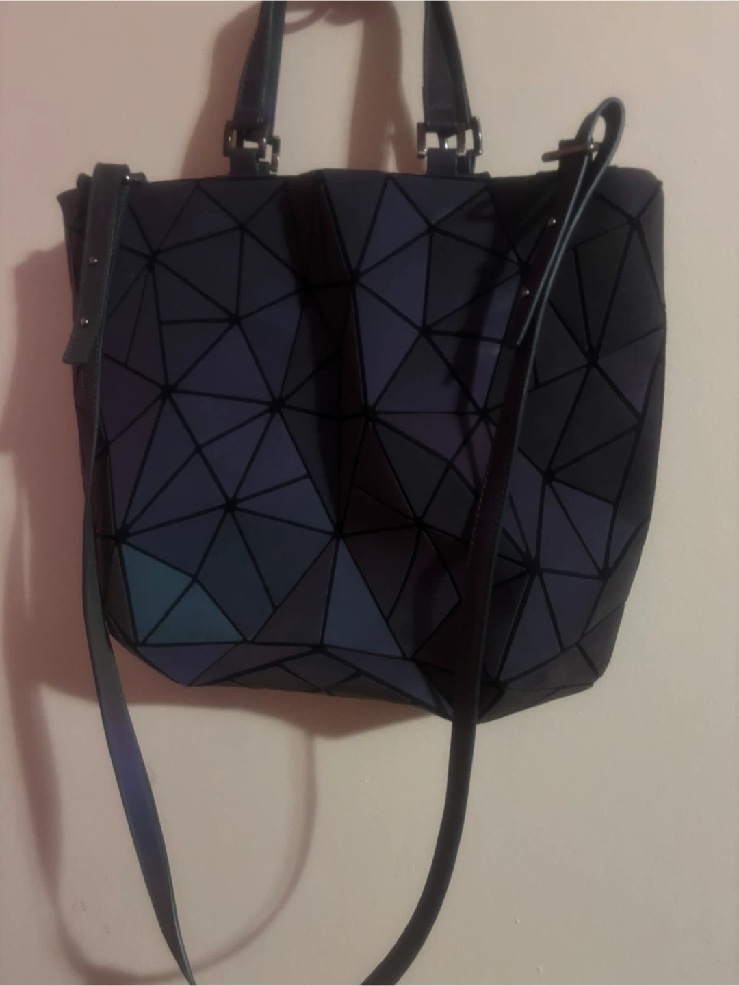 This tote bag features a unique geometric prism design that reflects light in various colours. It has two top handles and an adjustable shoulder strap. The interior has a zip pocket.