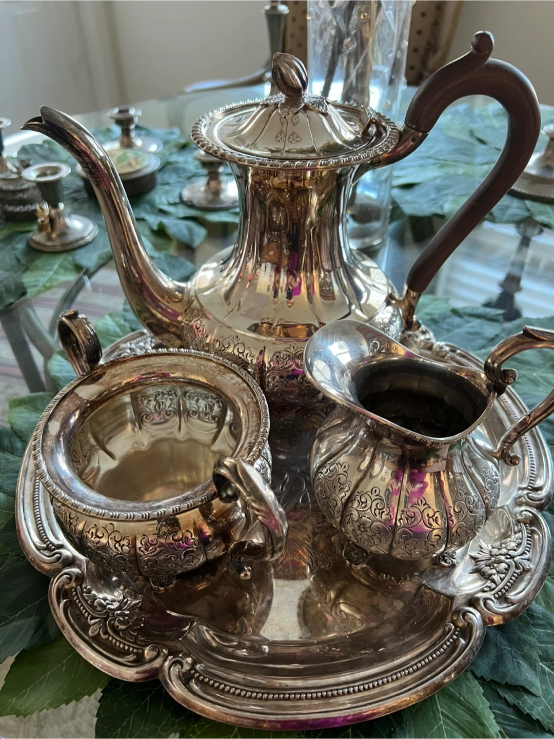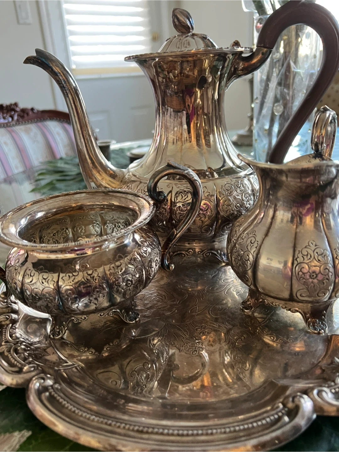 Elegant four-piece silver-plated tea set featuring ornate detailing and a dark wood handle on the teapot. Set includes a teapot, sugar bowl, creamer, and serving tray. This classic set adds a touch of vintage charm to any occasion.