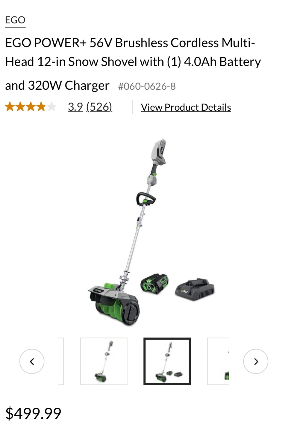 Brushless motor. Multi-head design. Includes 4.0Ah battery and 320W charger. Excellent condition, used for a week during snow storm this winter. Definitely helps and especially rescues you from the heavy lifting. Selling as I'm planning to move. Its currently listed $500 in canadian tire https://www.canadiantire.ca/en/pdp/ego-power-56v-brushless-cordless-multi-head-12-in-snow-shovel-with-1-4-0ah-battery-and-320w-charger-0600626p.html