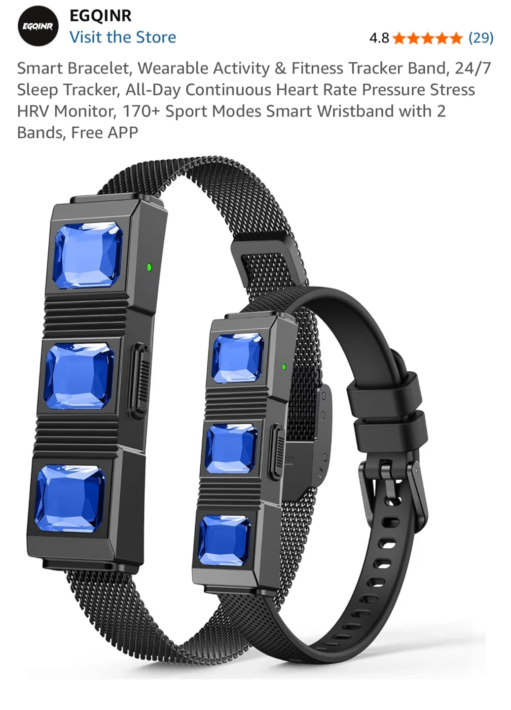 Selling an EGQINR smart bracelet, a wearable activity and fitness tracker. It features 24/7 sleep tracking, all-day continuous heart rate pressure stress HRV monitor, and 170+ sport modes. Comes with two bands and a free app!