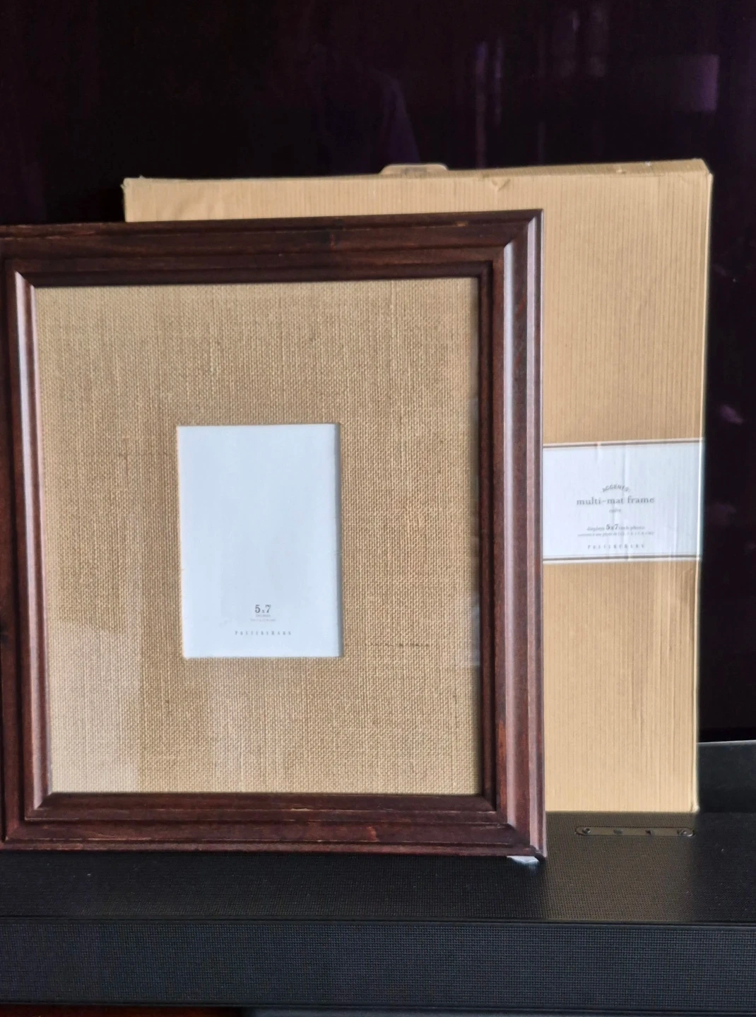 Pottery Barn multi-mat frame. Holds a 5x7 photo. Dark wood finish with a burlap mat. Never used. Includes original box.