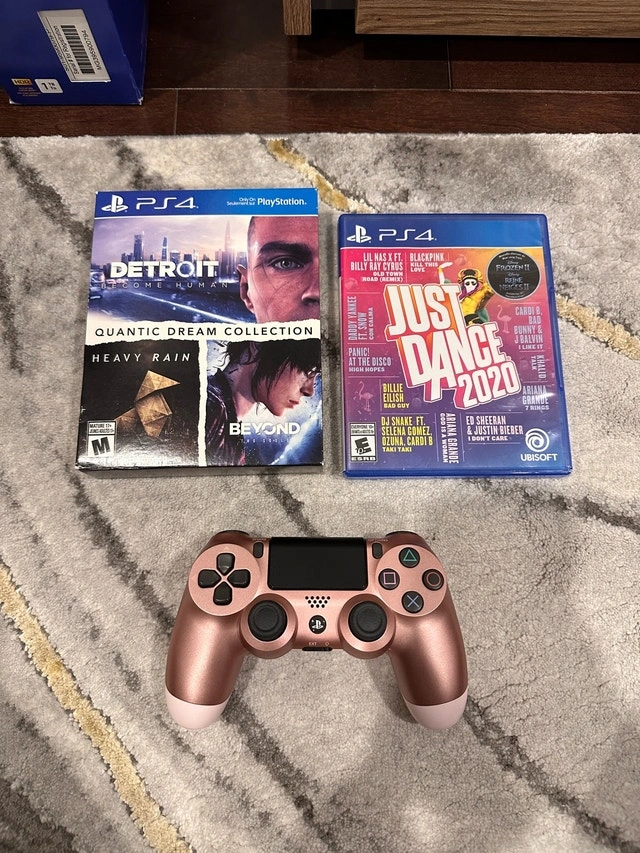 Includes PS4 1TB console, 2 controllers, power cord, USB cord, HDMI cord, and 4 games: Just Dance, Detroit: Become Human, Heavy Rain, and Beyond: Two Souls.