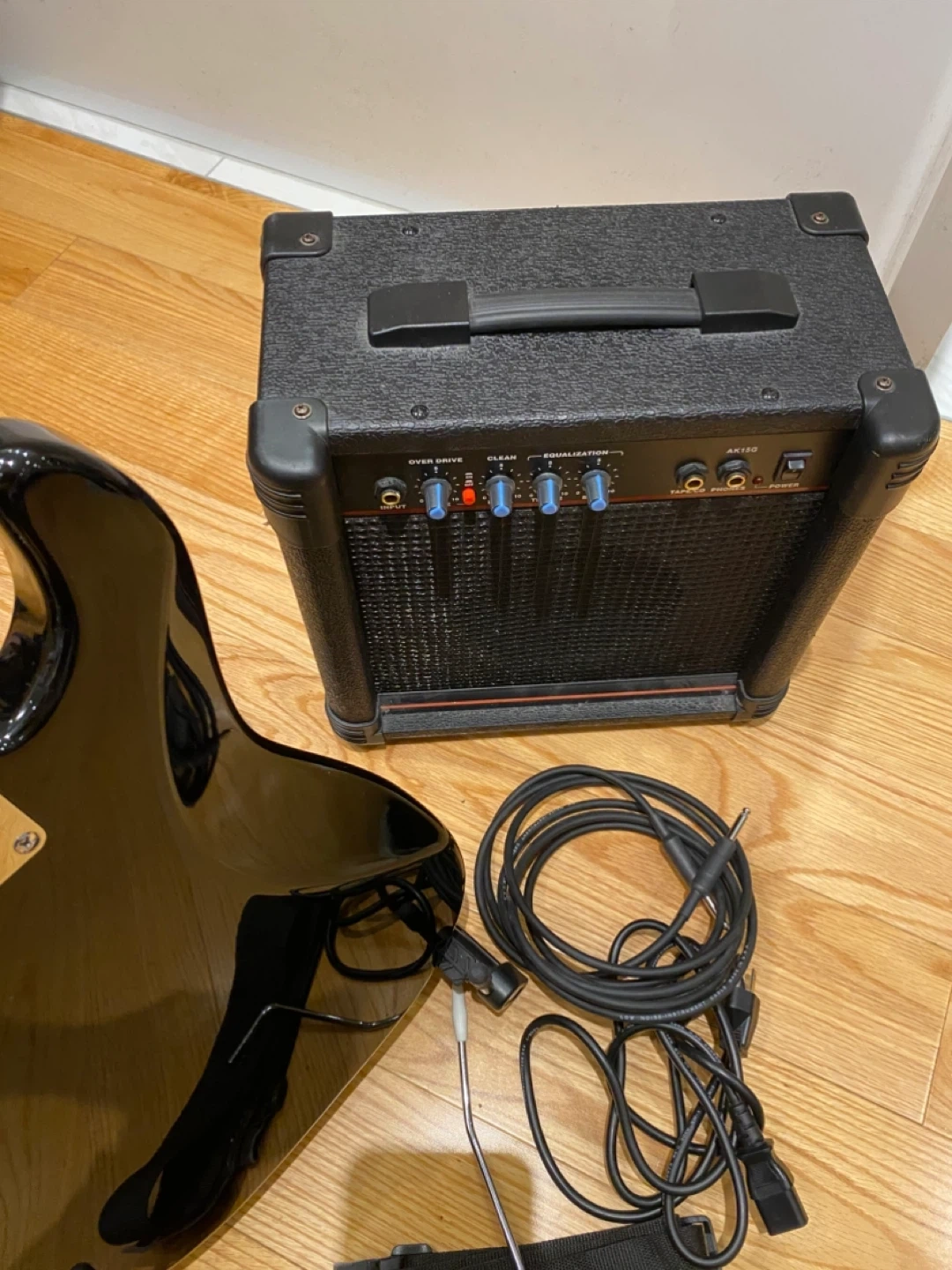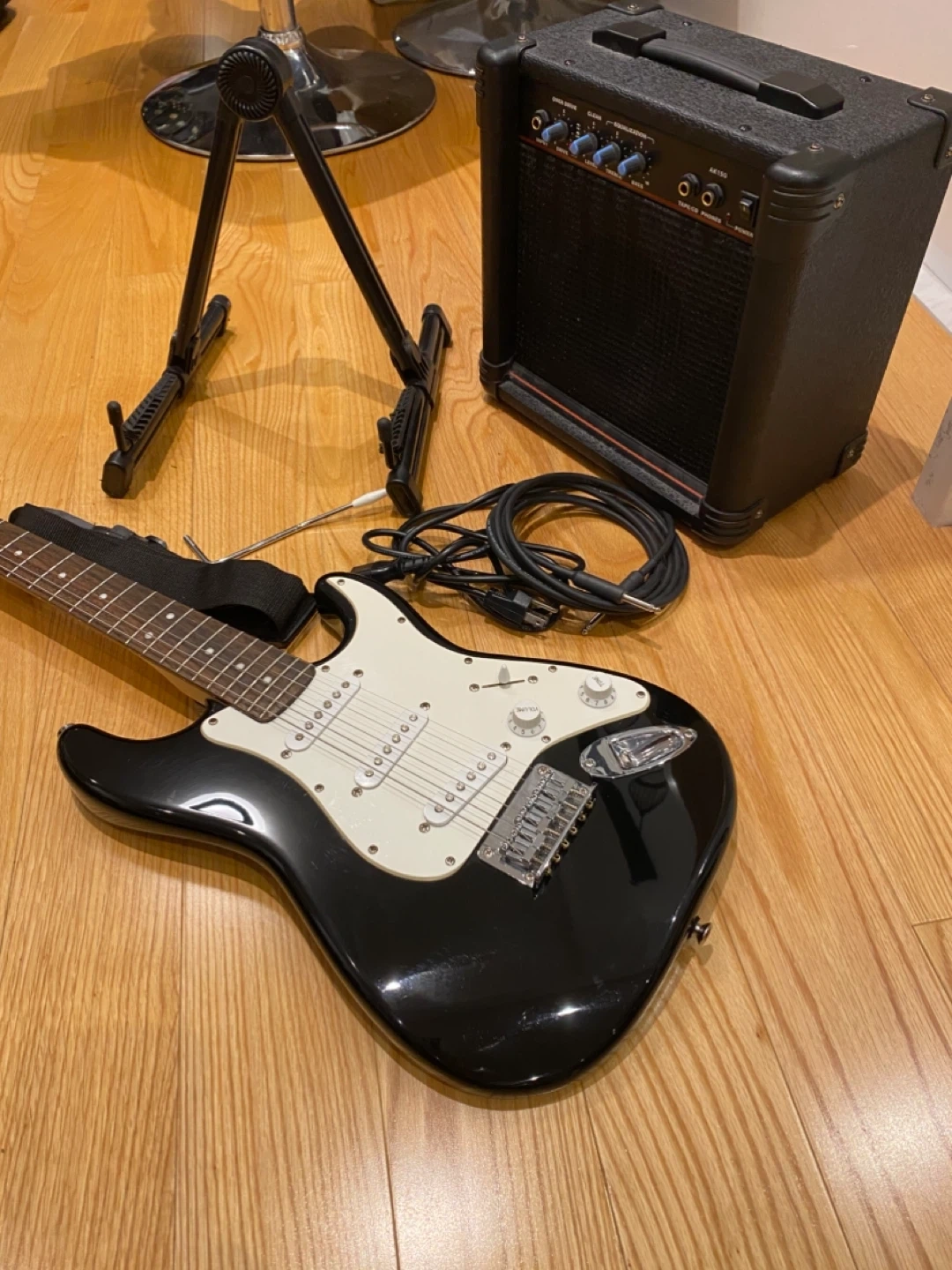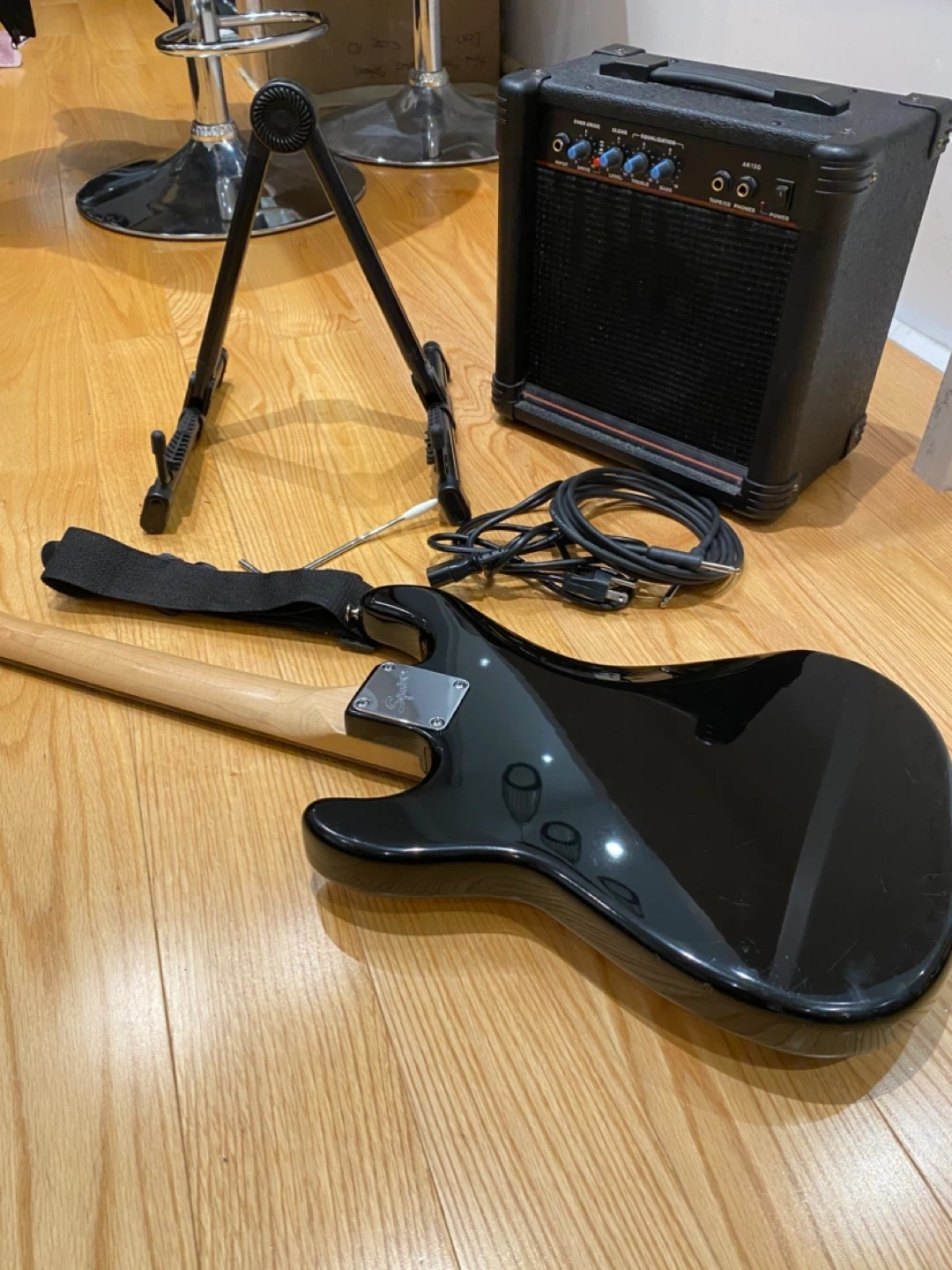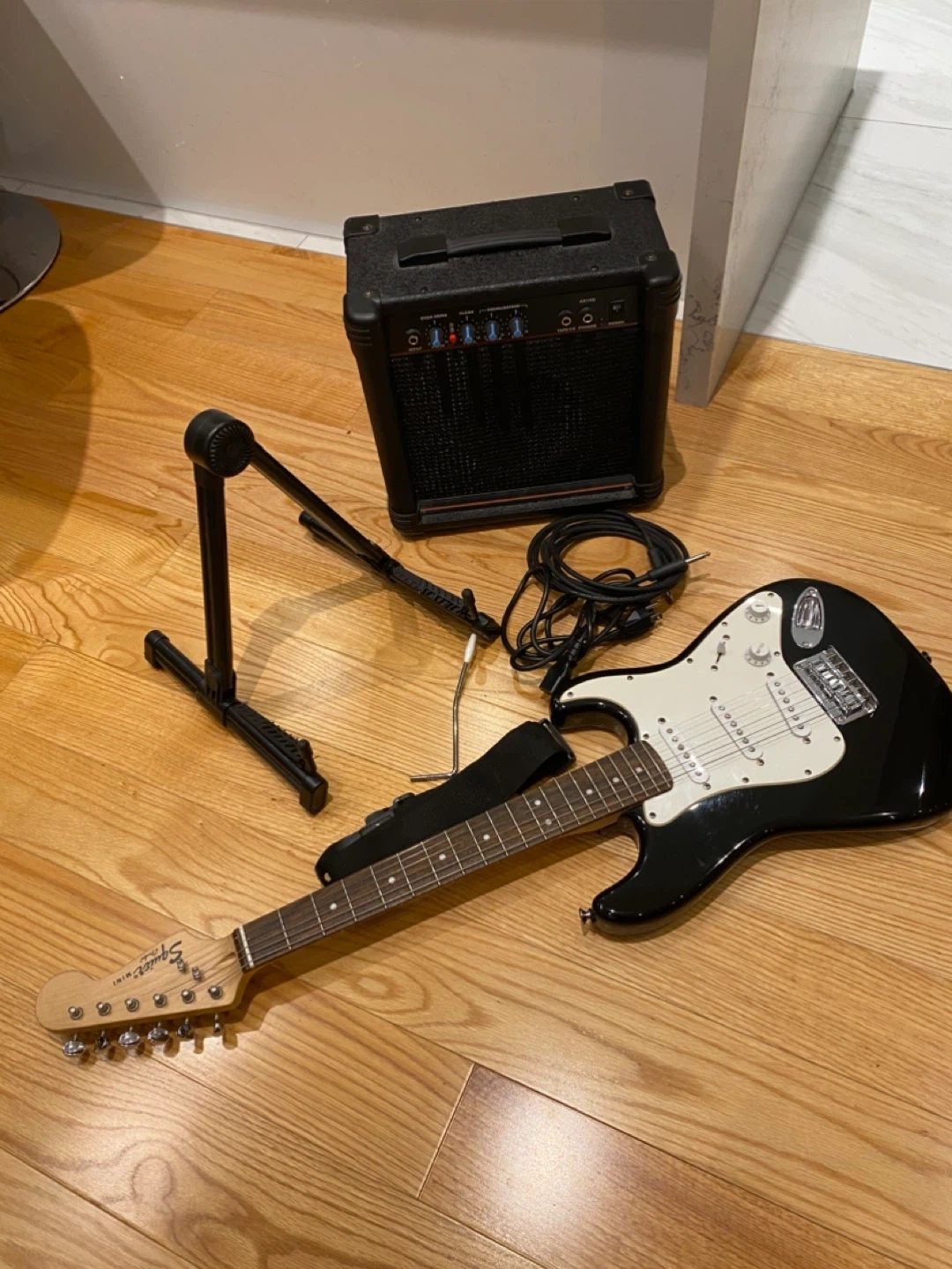 Selling my son Mini Squier by Fender electric guitar and Amplifier 15W in excellent condition. Very well taken care. Easy to play and has a beautiful sound. Good quality brand. Come with cable cord. Strap. Stand. Whammy bar and Picks. Ready to play. Asking 380$ . CASH only. No delivery. No trade. Thanks