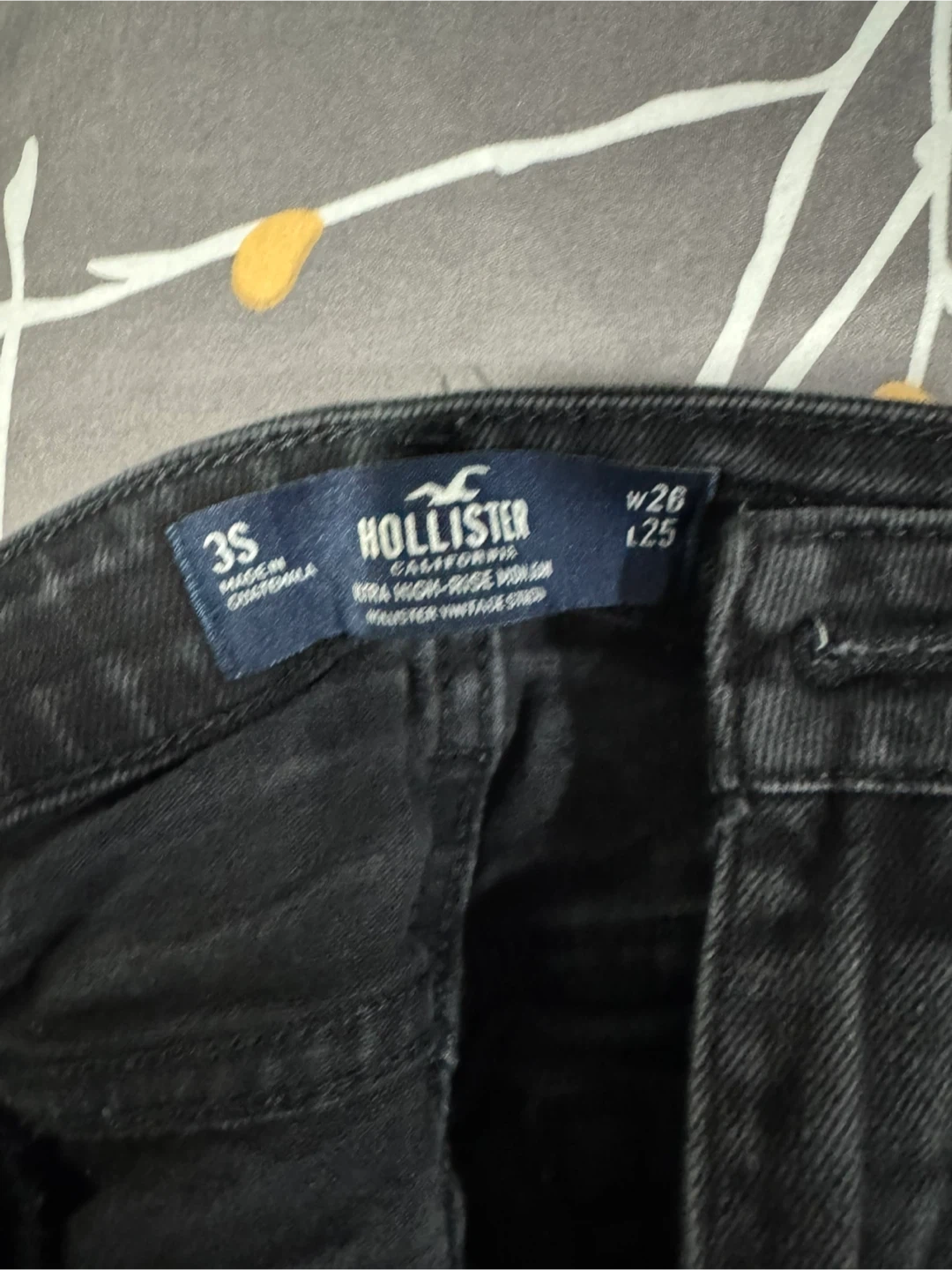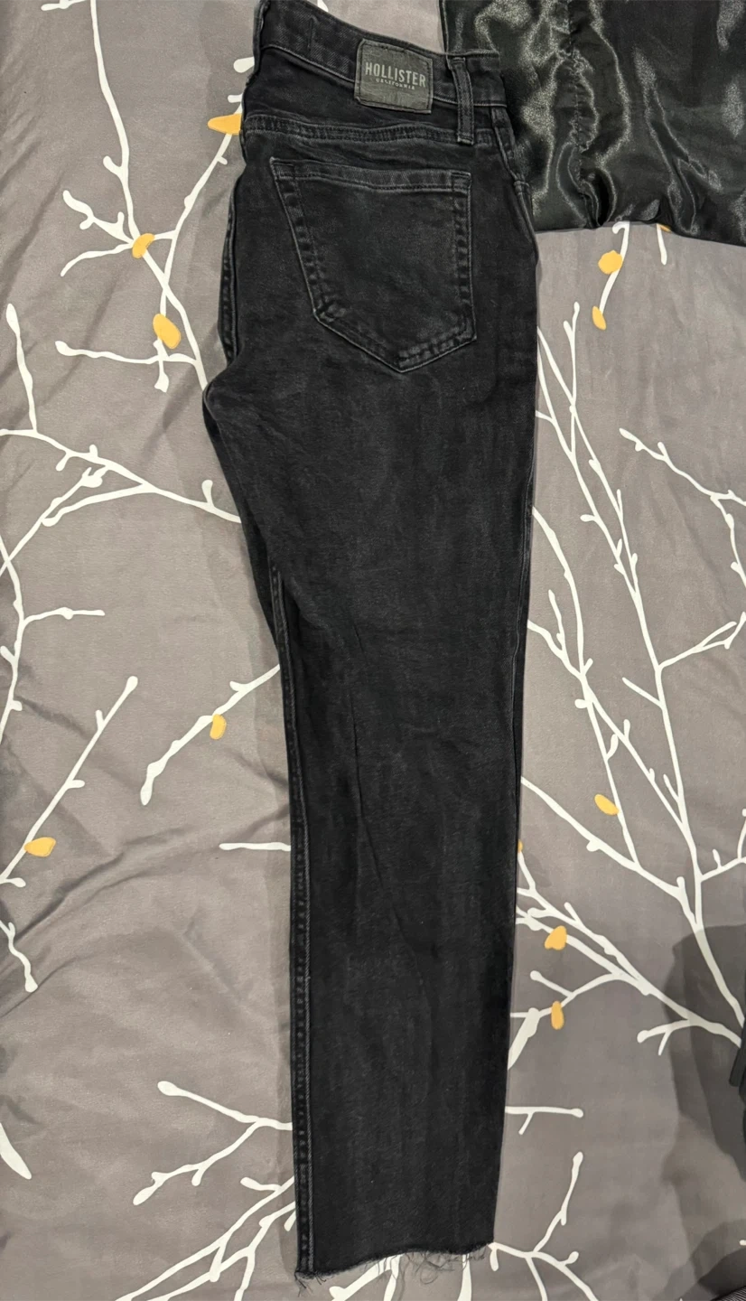 Hollister jeans in black wash. They're a size 26 waist and size 3 short. Made in Guatemala. These are ultra high-rise straight jeans with a raw hem.