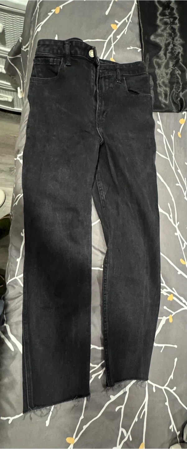 Hollister jeans in black wash. They're a size 26 waist and size 3 short. Made in Guatemala. These are ultra high-rise straight jeans with a raw hem.