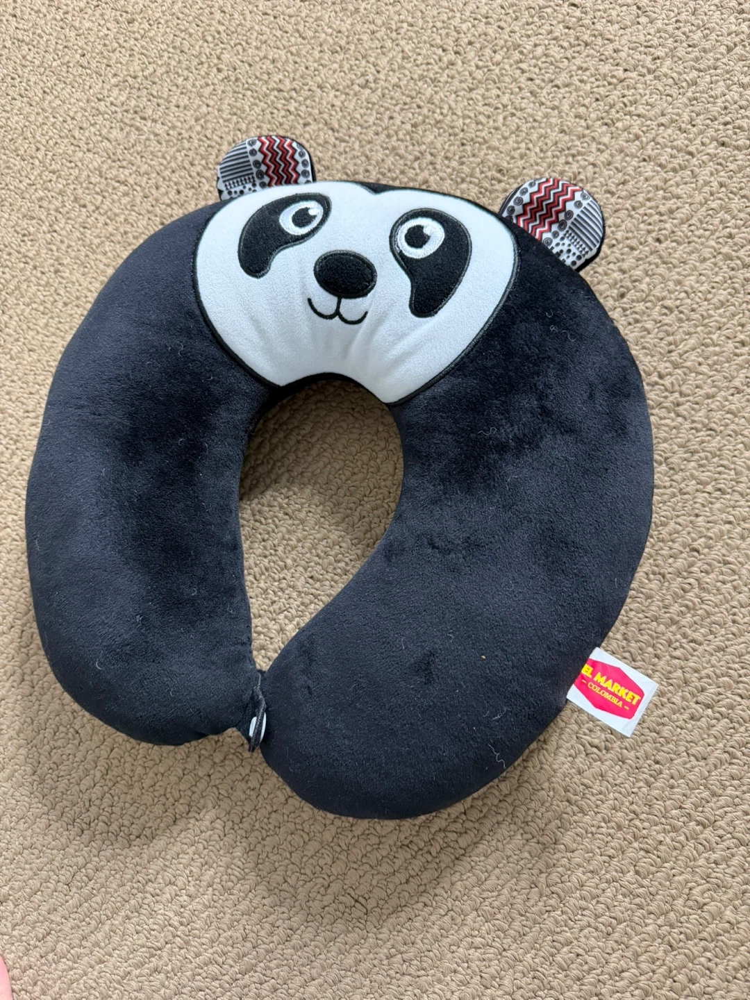 This travel neck pillow is designed with a cute panda face. It's made of soft plush material for comfort. Great for long trips!