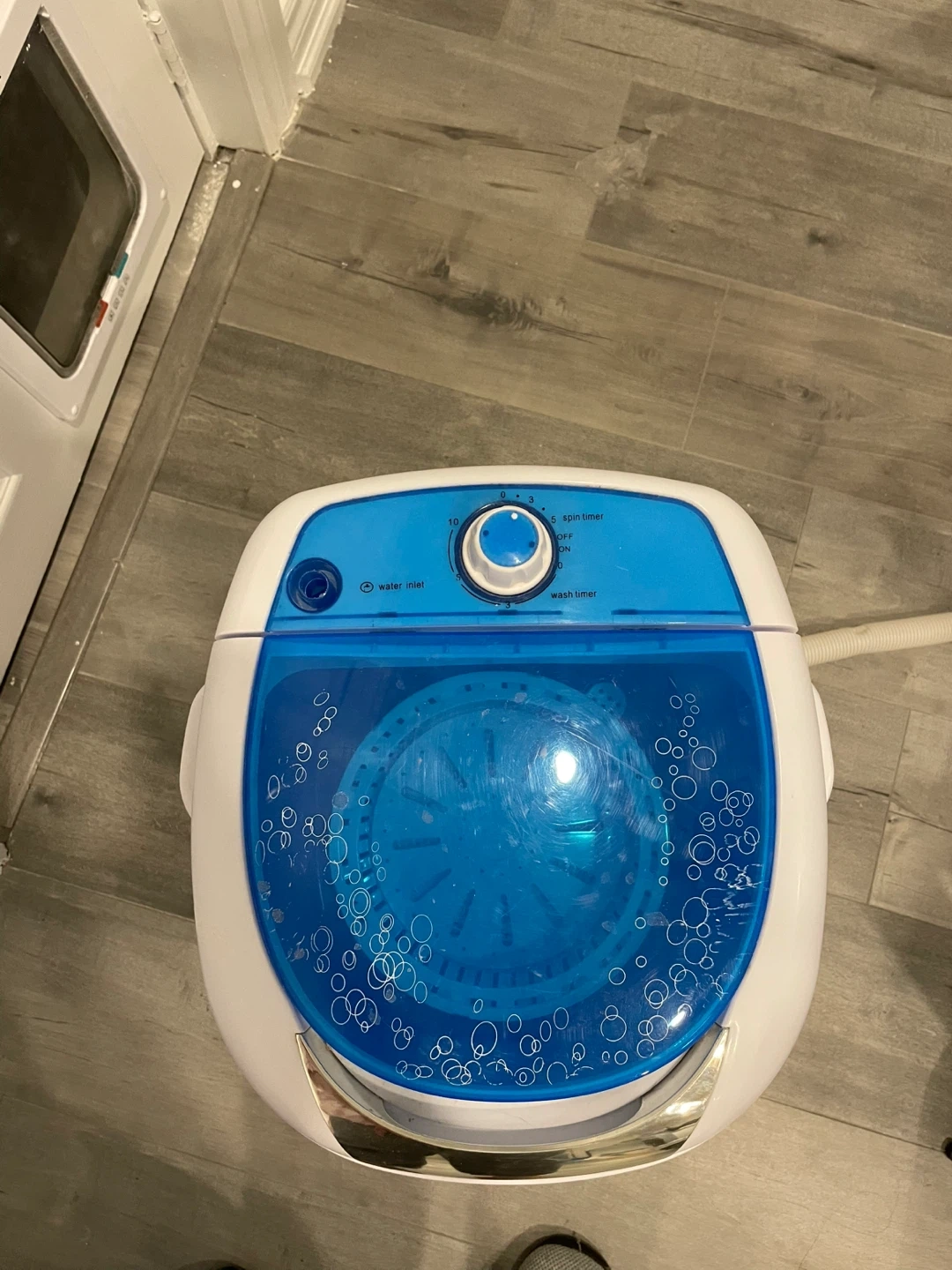 Compact portable washing machine with separate spin timer and wash timer functions. It's great for small loads or delicates. This machine is ideal for apartments or travel!