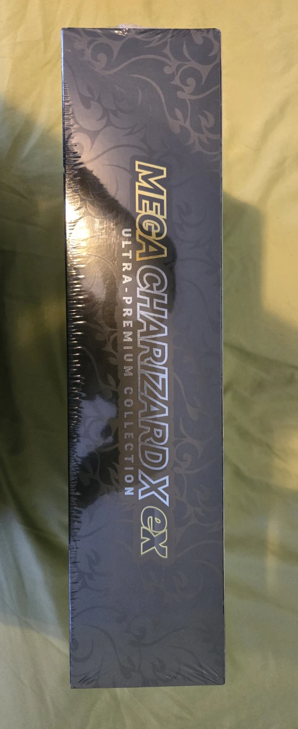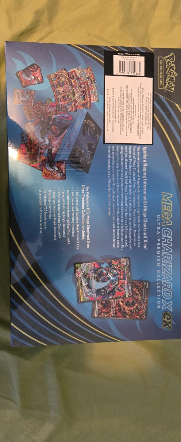 This is the Pokemon Mega Charizard EX Ultra-Premium Collection Box. It's sealed and contains trading cards. Includes a Mega Charizard EX jumbo card, a Mega Charizard X foil card, and other cards.