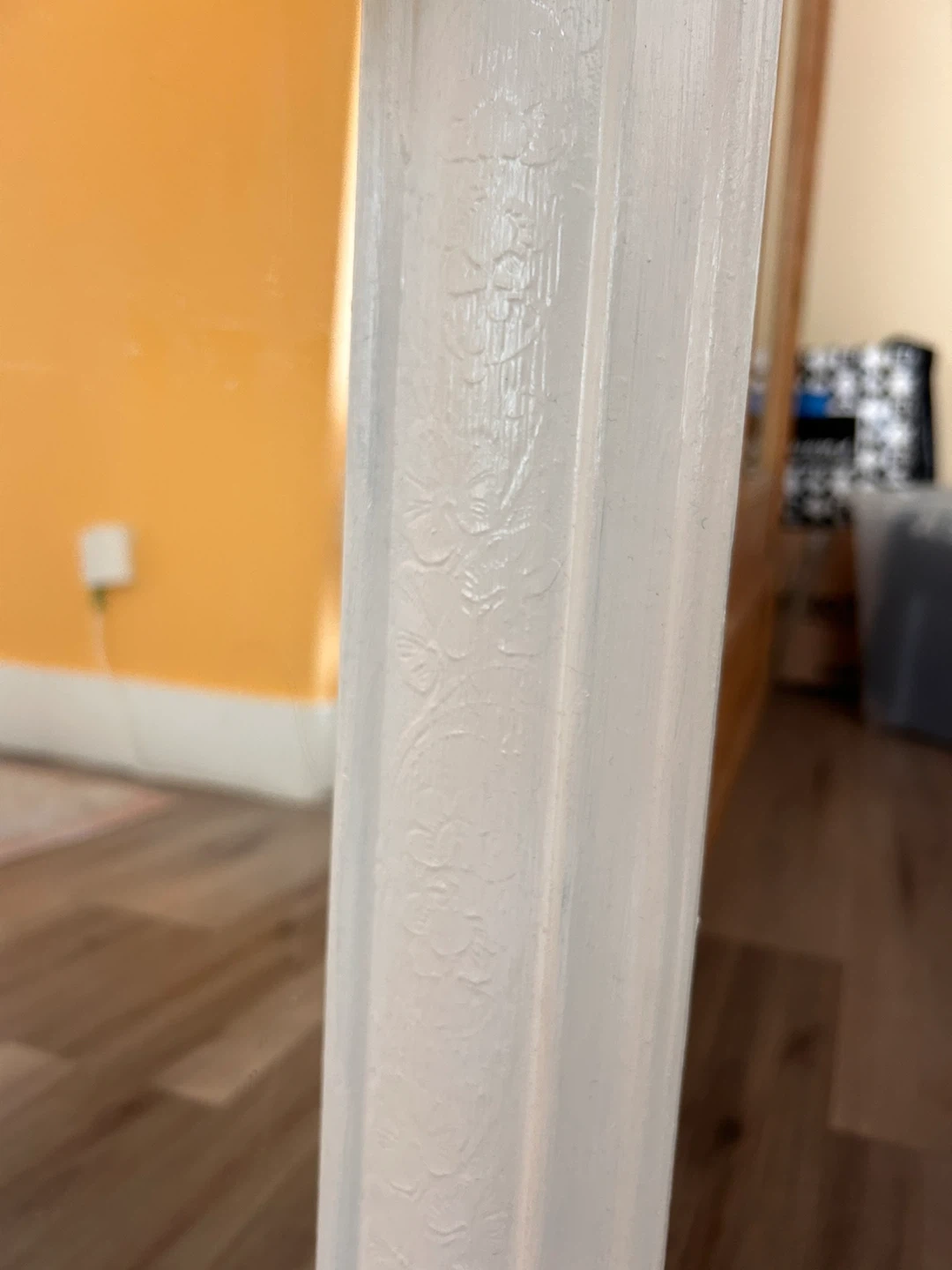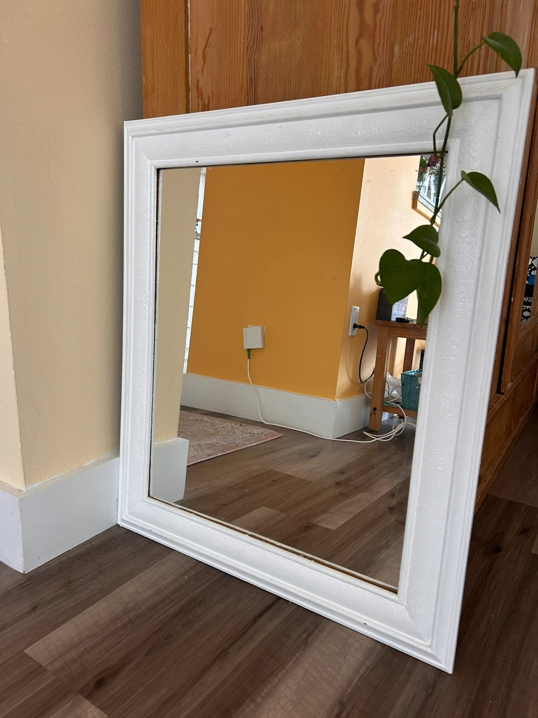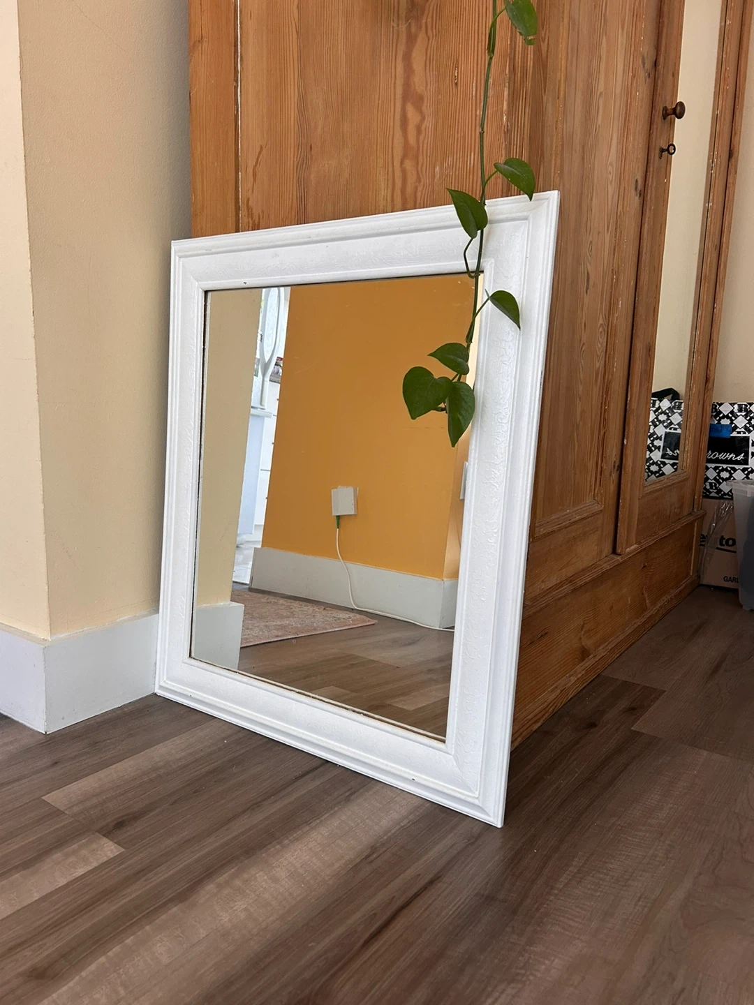 Lovely white framed mirror with a decorative embossed pattern on the frame. It's a great size for entryways or bedrooms. Adds a touch of style to any room!