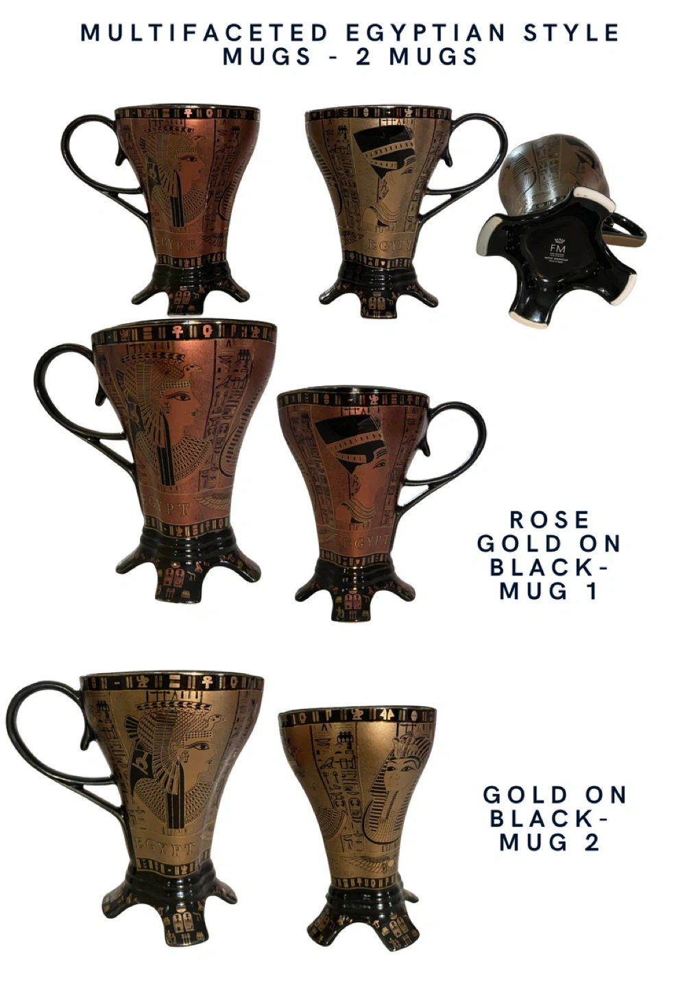 10Selling a set of 2 multifaceted Egyptian style mugs! One mug features rose gold on black, and the other features gold on black. They're in great condition and ready for a new home. Made in Egypt.