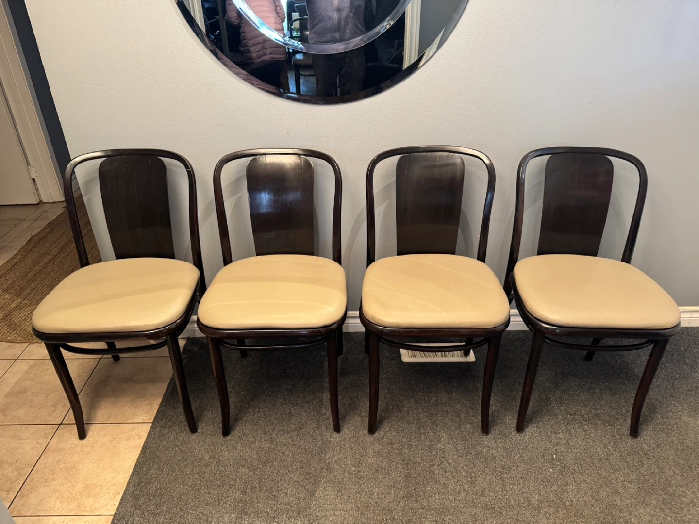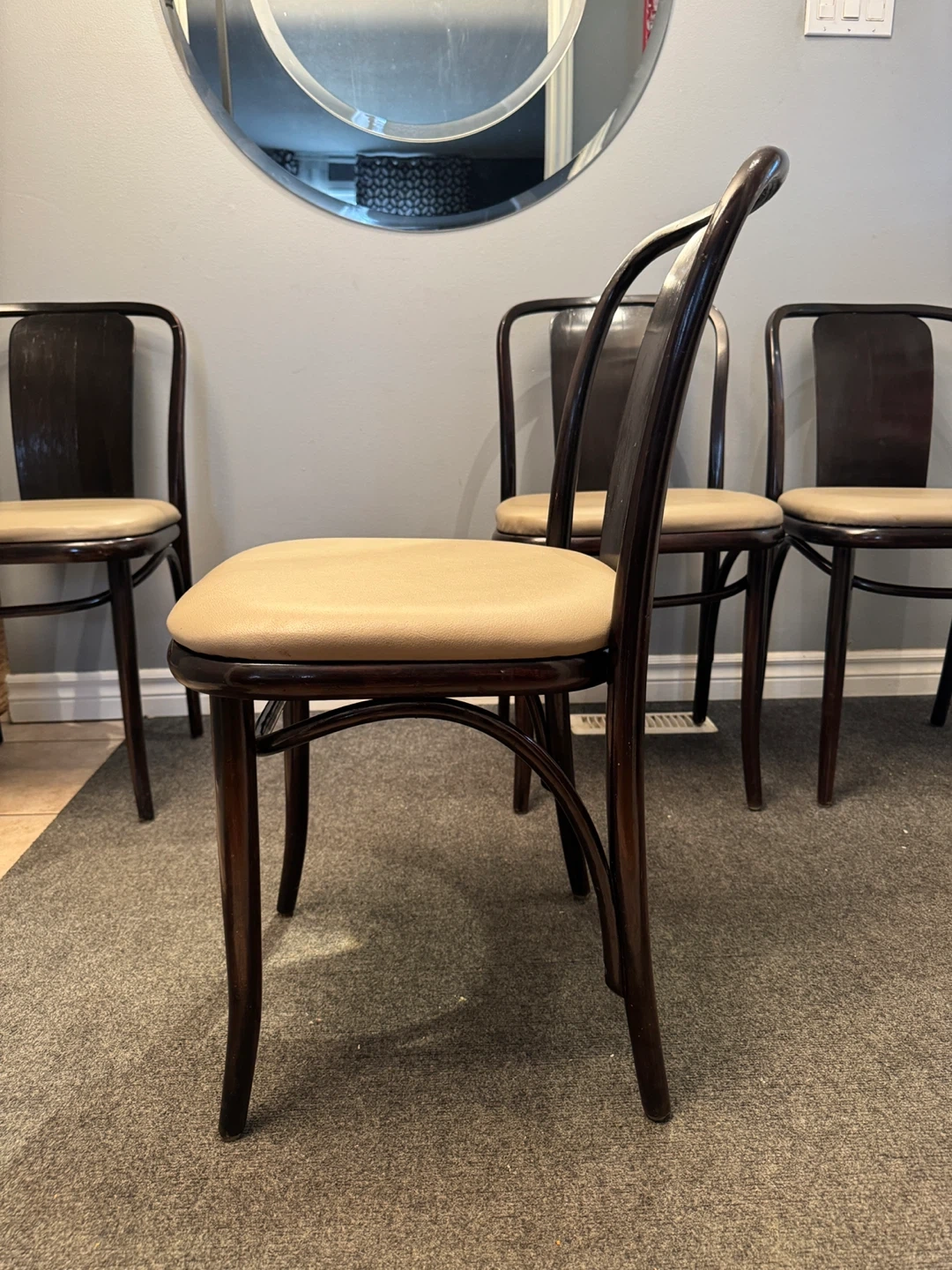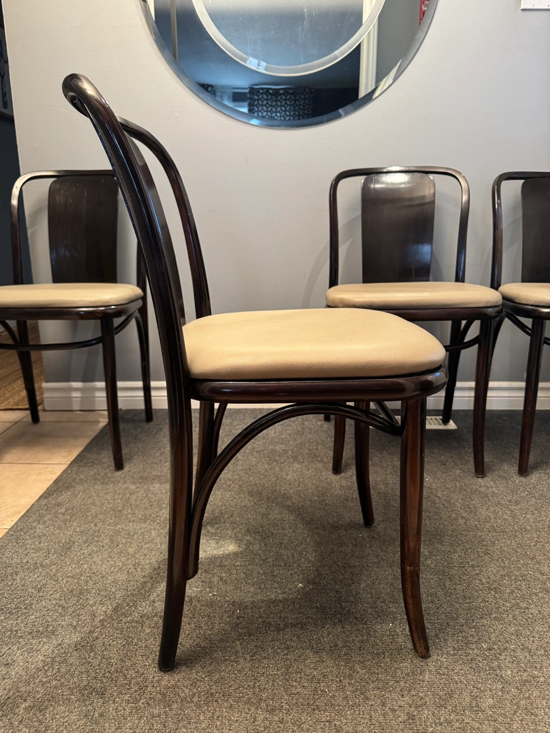 Set of six chairs with dark bentwood frames and light beige upholstered seats. These chairs have a classic, elegant design. They're great for a dining room or accent seating. Wood frames and fabric seats.