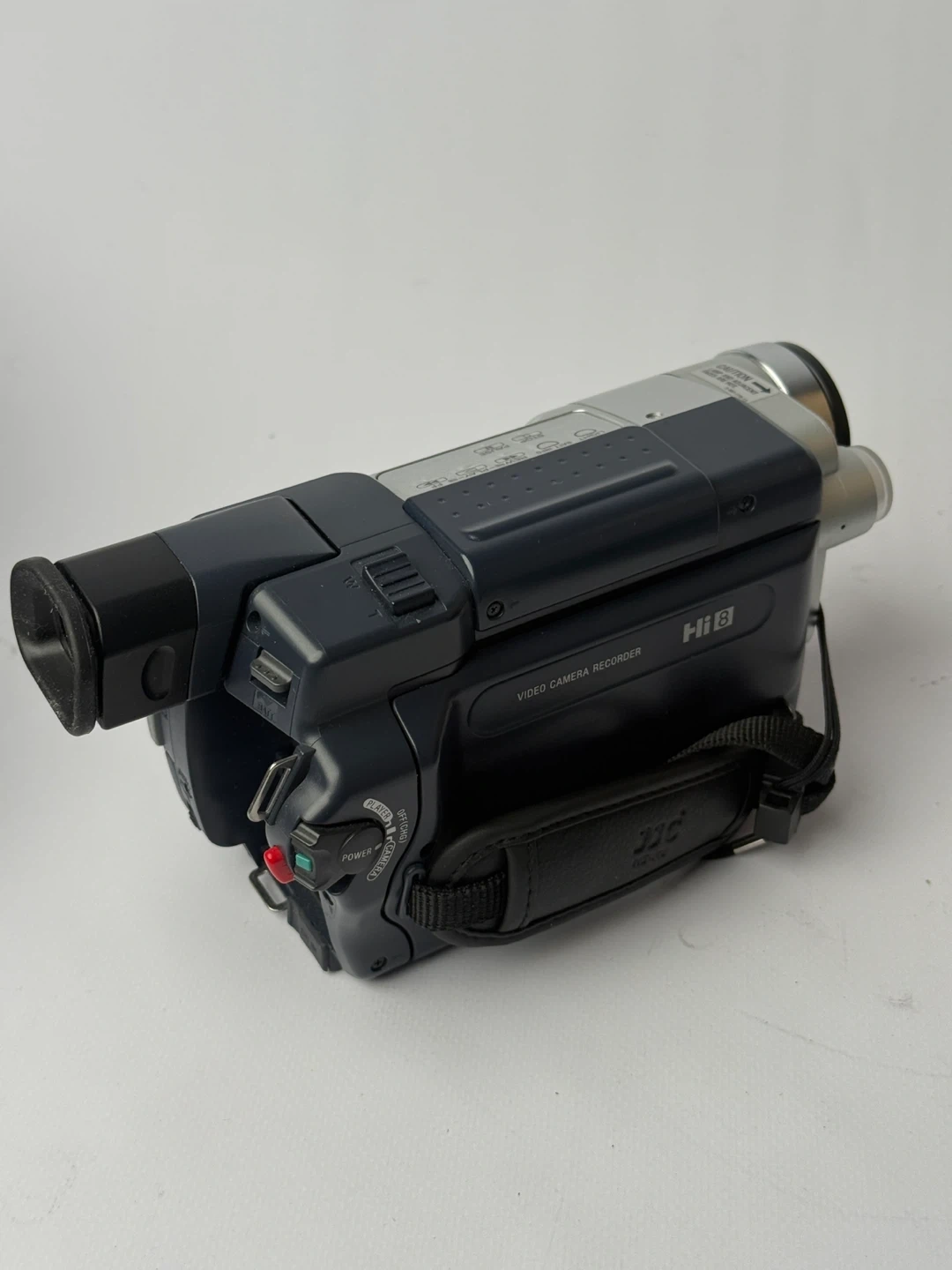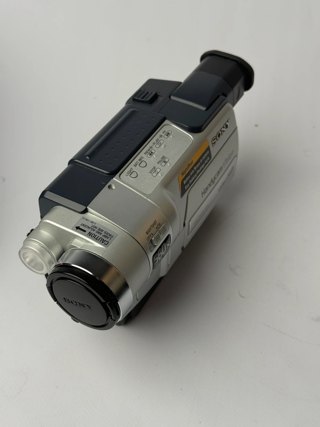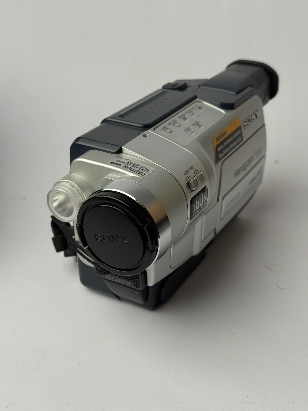 This Sony Handycam Hi8 video camera recorder is silver and dark grey. It features NightShot capability and 360x zoom. Perfect for capturing memories!