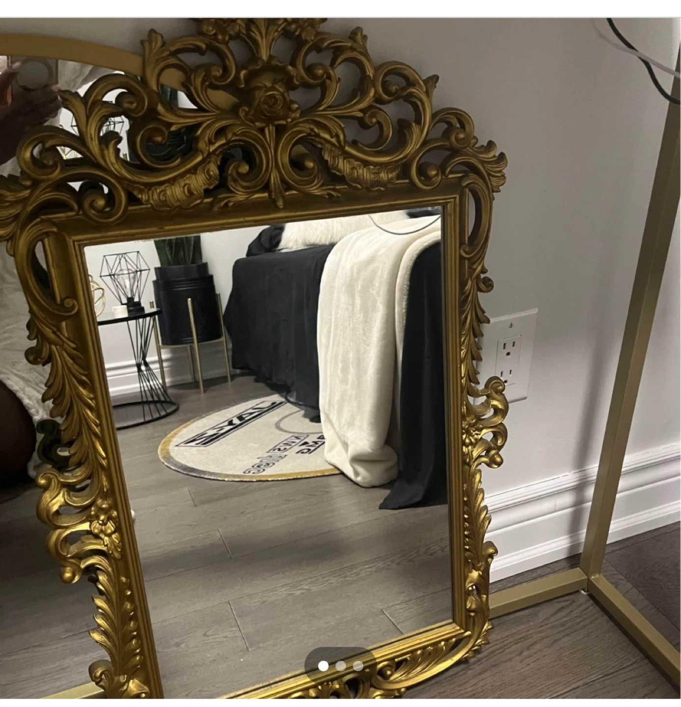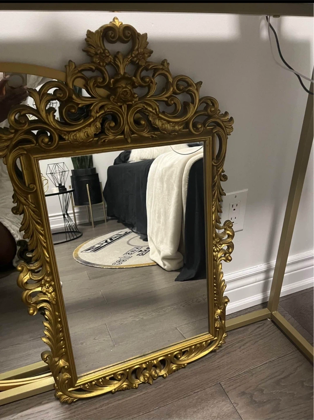 Decorative gold mirror with an ornate, vintage-style frame. It's perfect for adding a touch of elegance to any room. The frame is made of durable material and features intricate detailing.