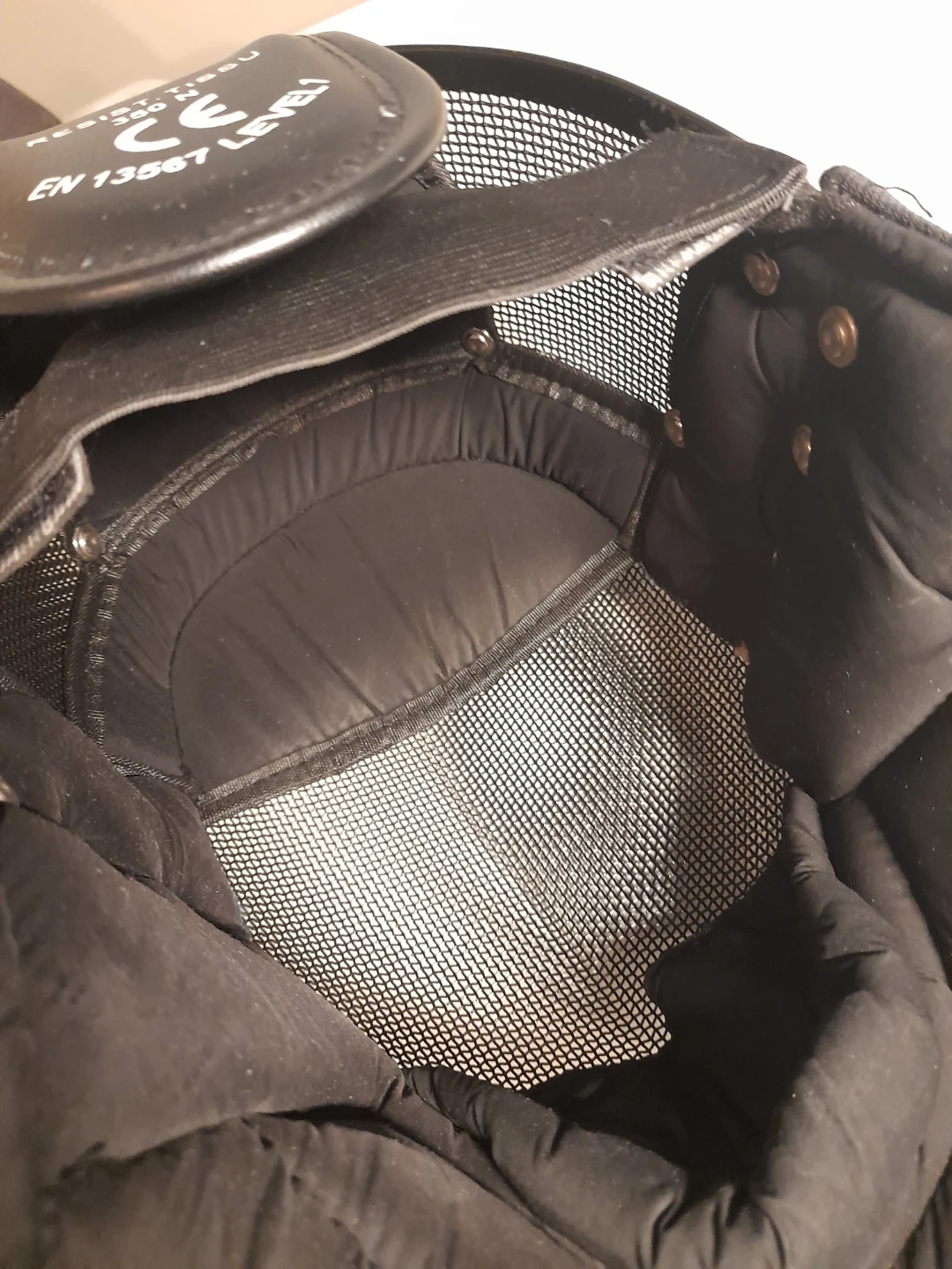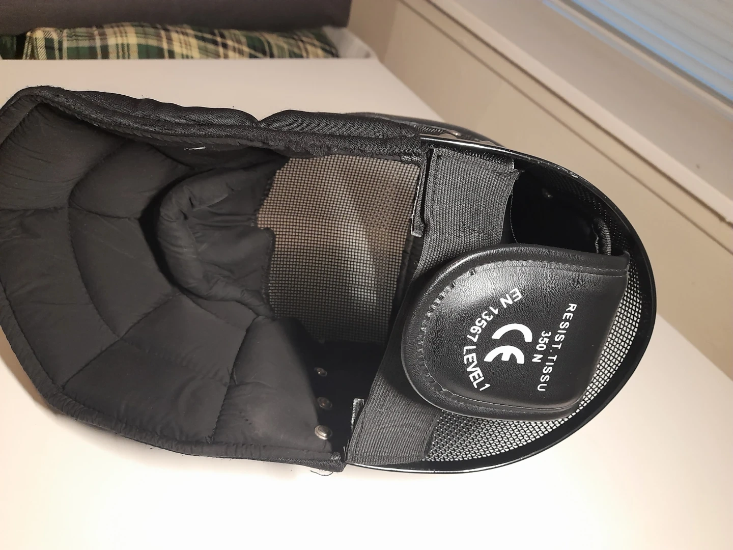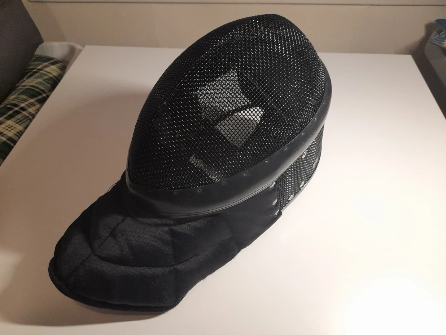 Black fencing mask with mesh front. It's a Level 1 safety rating with 350 N resistance. This mask is designed for protection during fencing practice and HEMA. Fully functional, no smells or heavy damage.