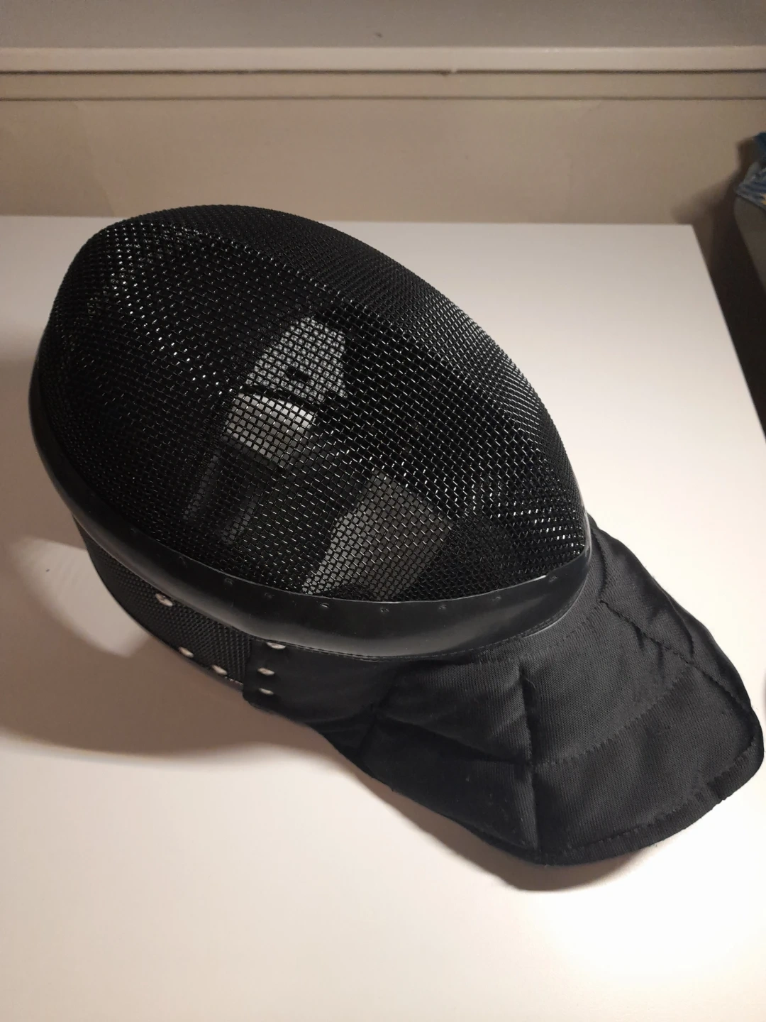 Black fencing mask with mesh front. It's a Level 1 safety rating with 350 N resistance. This mask is designed for protection during fencing practice and HEMA. Fully functional, no smells or heavy damage.