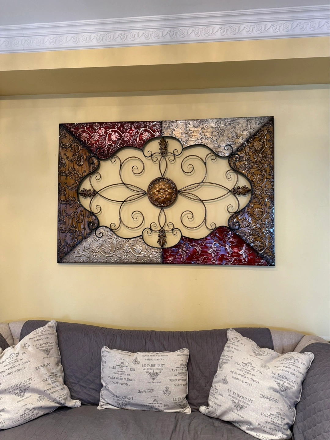 Large rectangular wall hanging. Features metal scrollwork design, burgundy, light gold and bronze accents. Adds elegance to any room. Great for indoor and outdoor use. Price $50 dollars.