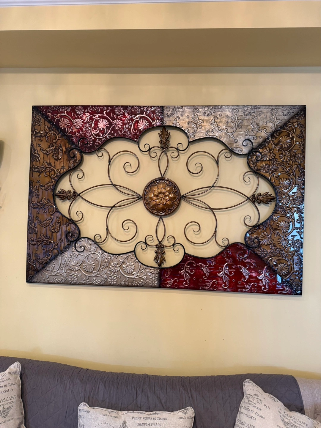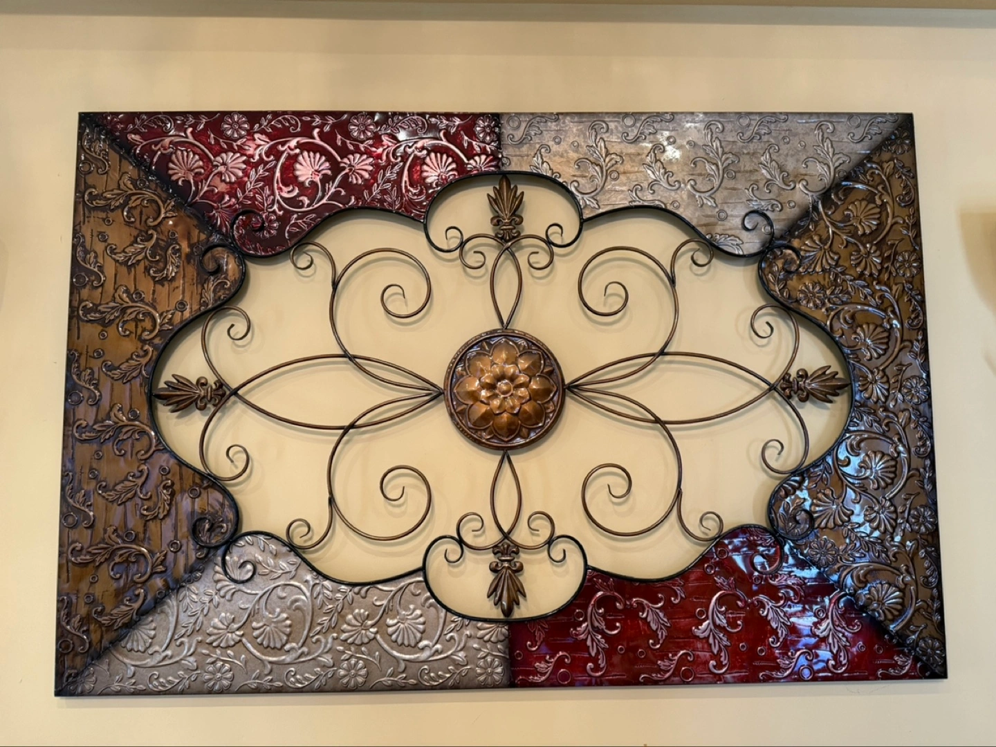 Large rectangular wall hanging. Features metal scrollwork design, burgundy, light gold and bronze accents. Adds elegance to any room. Great for indoor and outdoor use. Price $50 dollars.