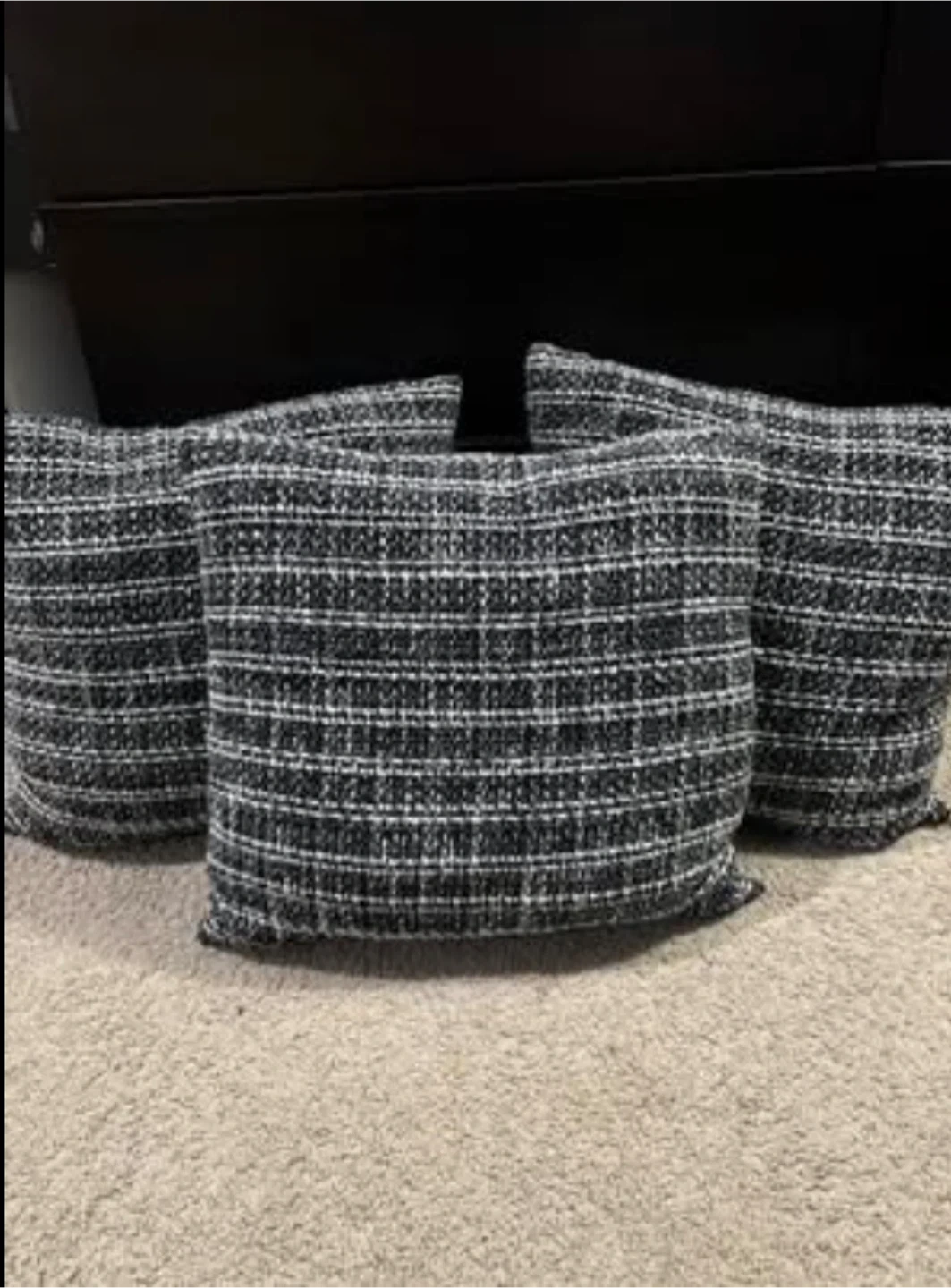 A set of three decorative throw pillows with a tweed-like fabric. The pillows have a black, white, and grey checkered pattern. They'd add a cozy touch to any sofa or armchair!
