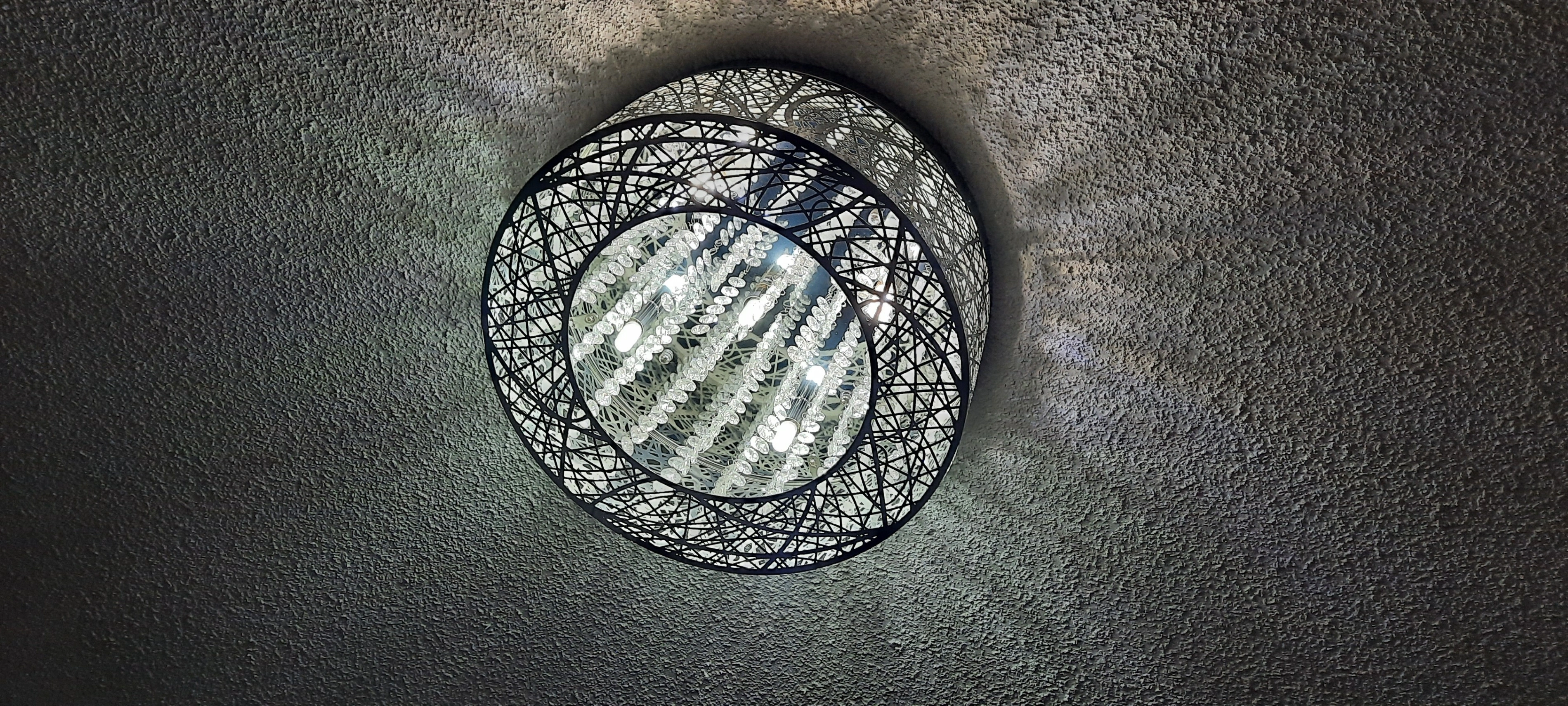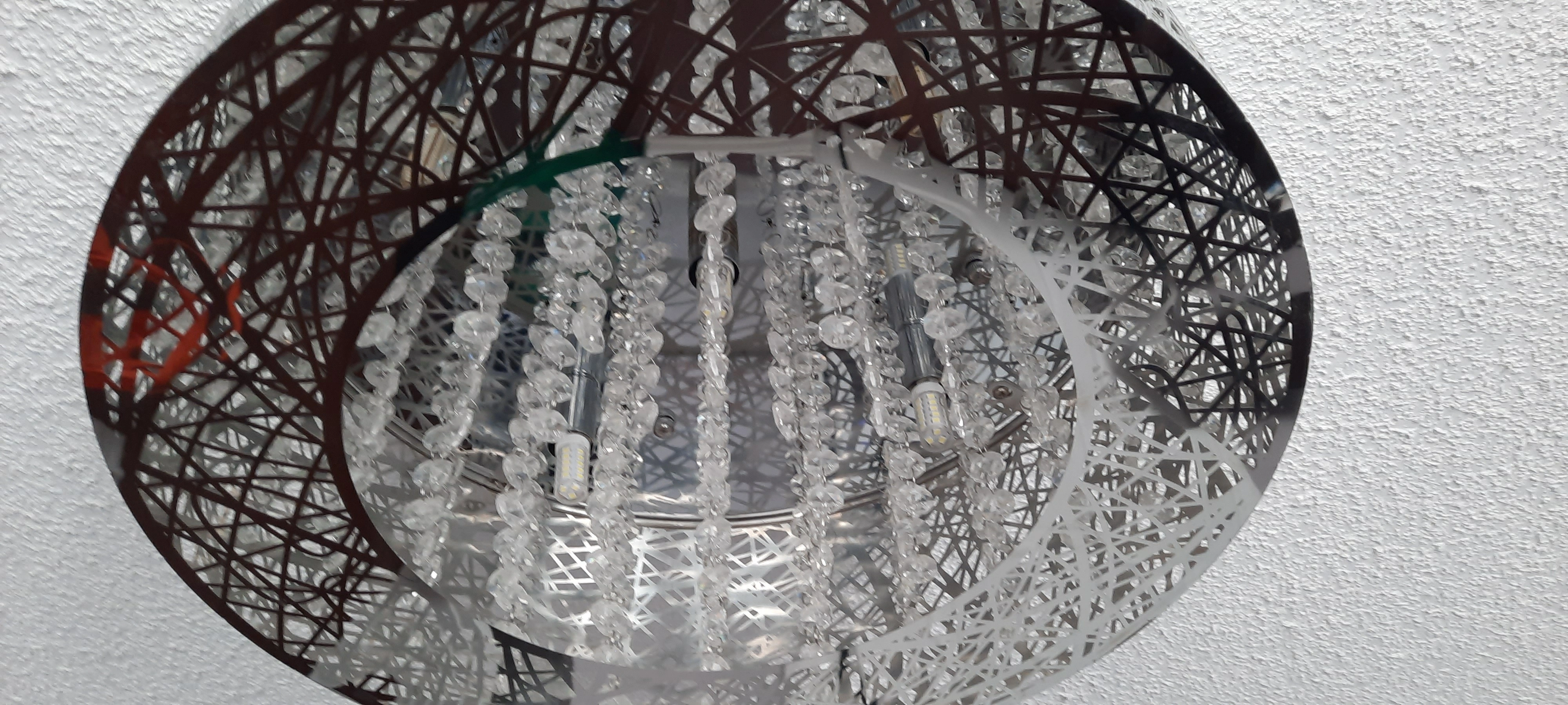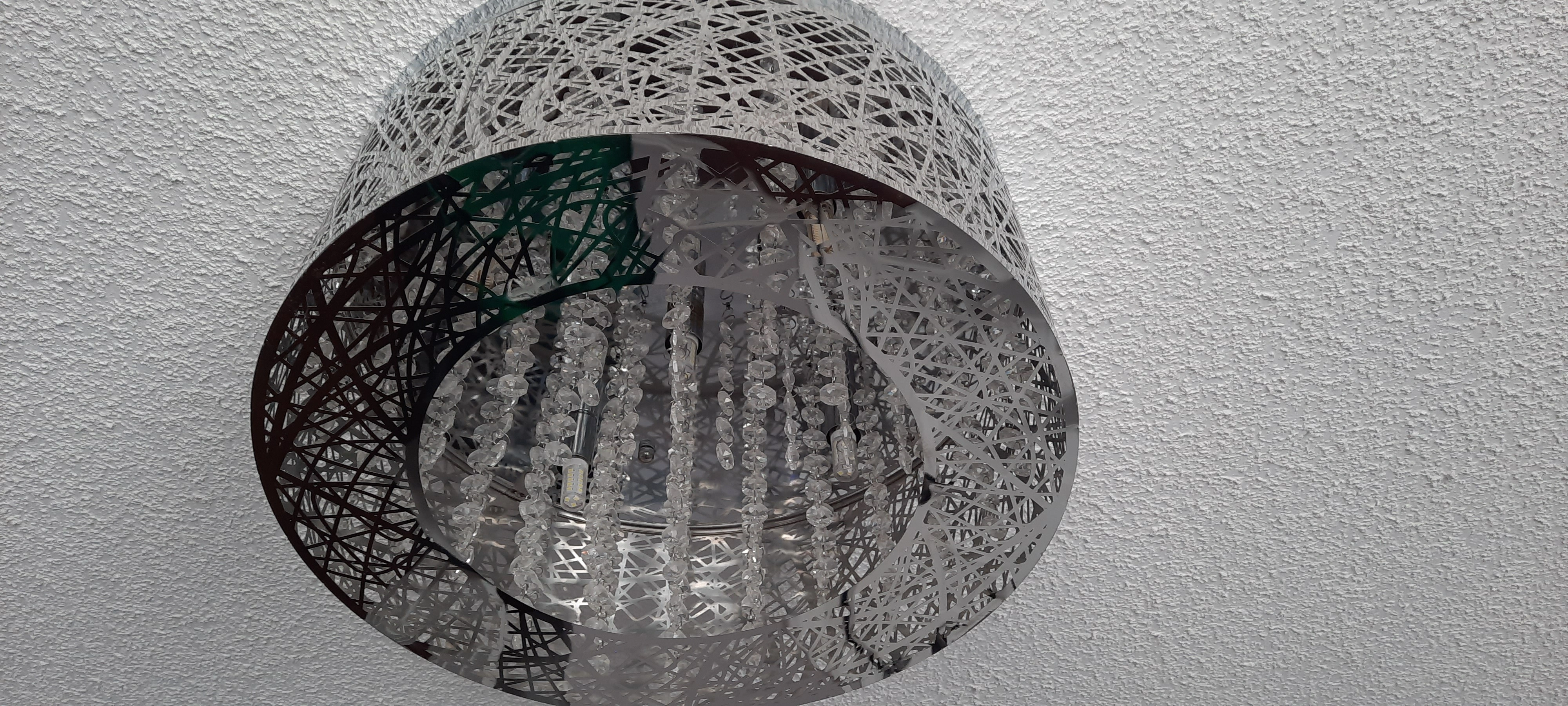 The laser cut stainless steel mirror shade features a unique design and pairs with crystal pendants for added luxury.