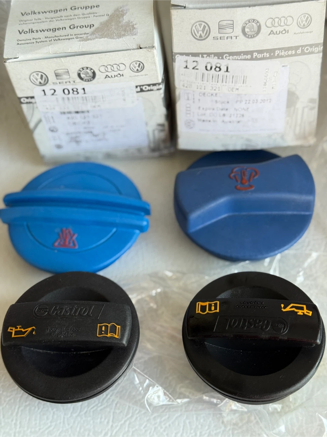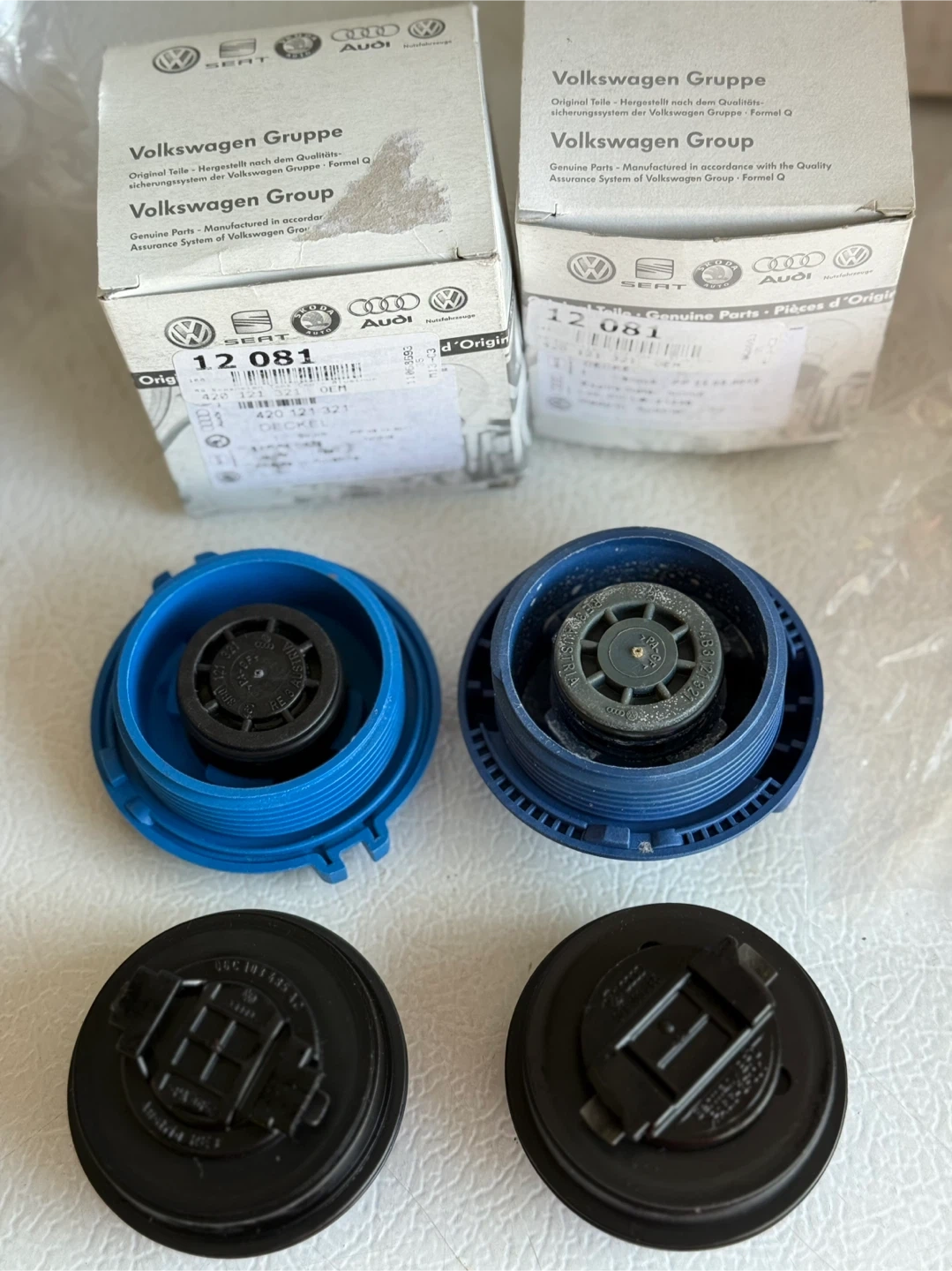 Selling a set of Volkswagen Group oil and coolant caps. These are genuine parts manufactured in Germany. The blue caps are for coolant, and the black caps are for oil. They are in excellent condition and ready to use
