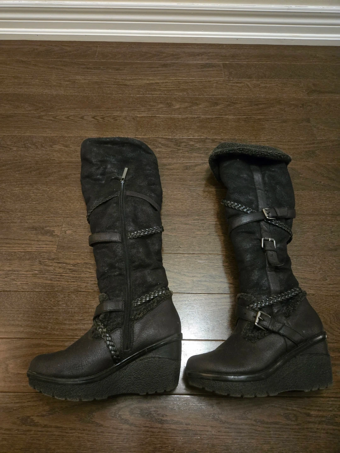 They feature braided detailing, buckles, and a cozy faux fur lining at the top. Side zippers make them easy to put on. These boots are great for adding a fashionable touch to your winter outfits!