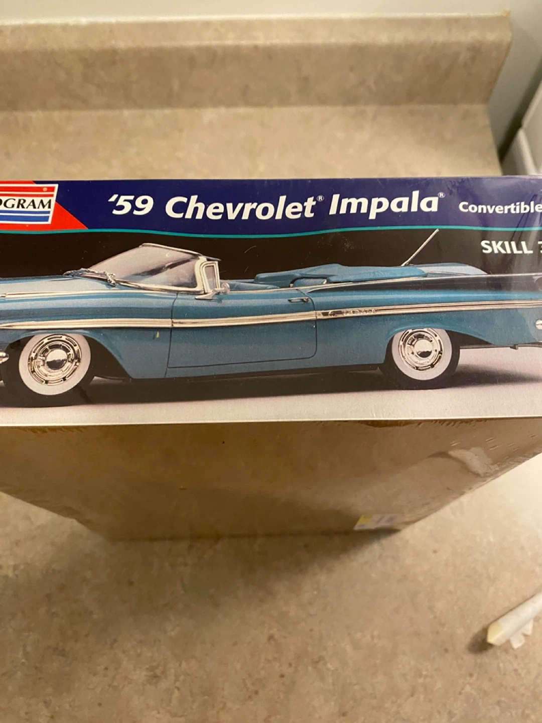 This is a Monogram model kit of a '59 Chevrolet Impala convertible. It features a highly detailed interior with a continental spare tire kit. The kit includes metallic blue, white, transparent red, and clear parts with plated parts and black vinyl tires. This model is skill level 2, requiring glue for assembly. Never opened packed in original box.