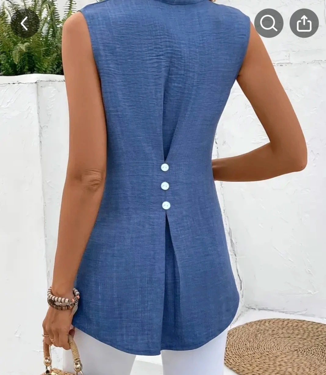 Blue sleeveless V-neck top with a textured weave. It features a button-down detail on the back. This top is made from a lightweight fabric. It's perfect for warmer weather!