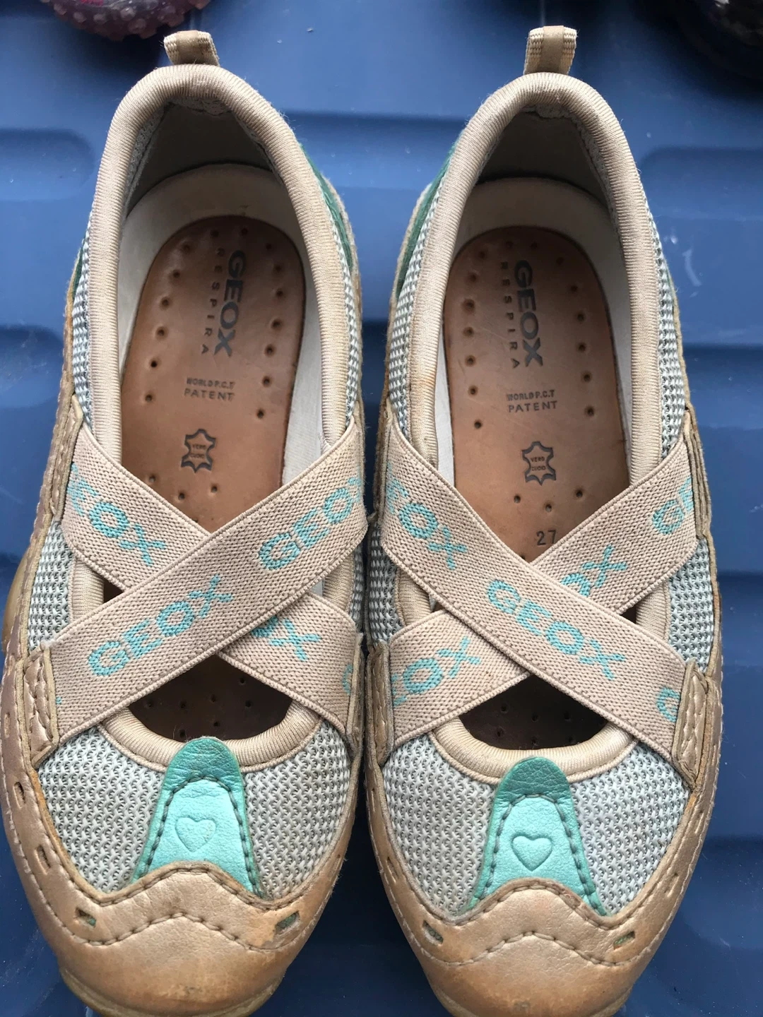 These are Geox Respira kids shoes in size 27. They have a beige and light blue design with criss-cross straps. The soles feature Geox's signature breathable technology.