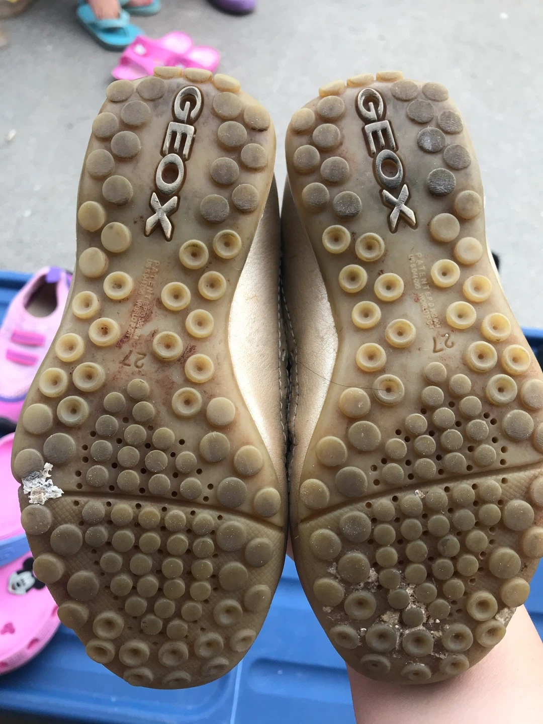 These are Geox Respira kids shoes in size 27. They have a beige and light blue design with criss-cross straps. The soles feature Geox's signature breathable technology.