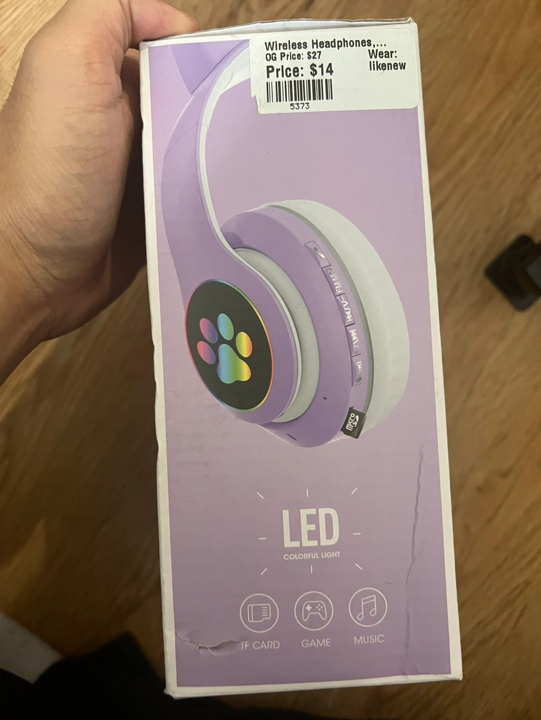 Purple and white wireless headphones with cat ears. The headphones have a paw print LED light and come with a charging cable.