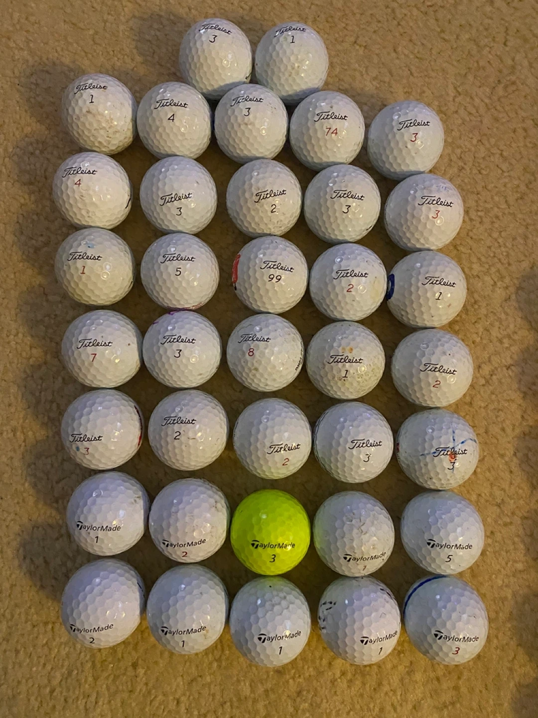 Assortment of used Titleist ProV1 and TaylorMade TP5golf balls. Includes one bright yellow TaylorMade ball. These are ideal for a round of golf.