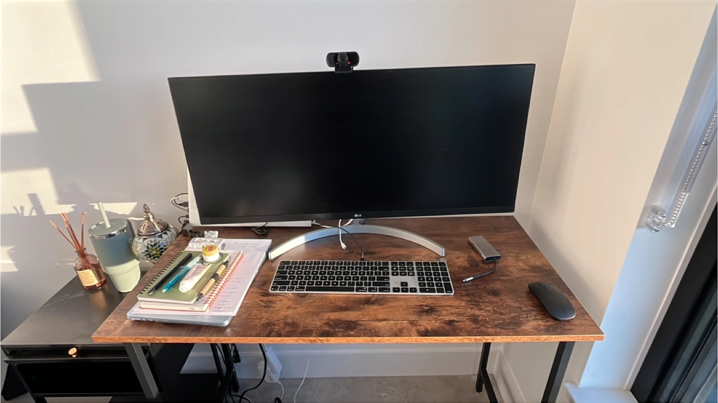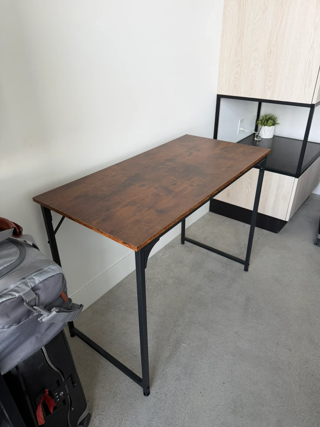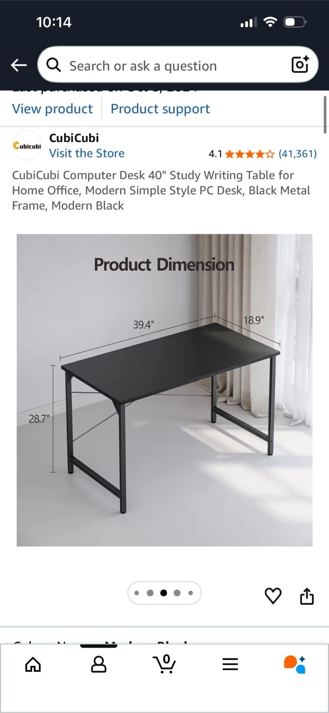 This CubiCubi computer desk is a 40-inch study and writing table. It features a black metal frame and a modern black finish. Please see the last image for dimensions.