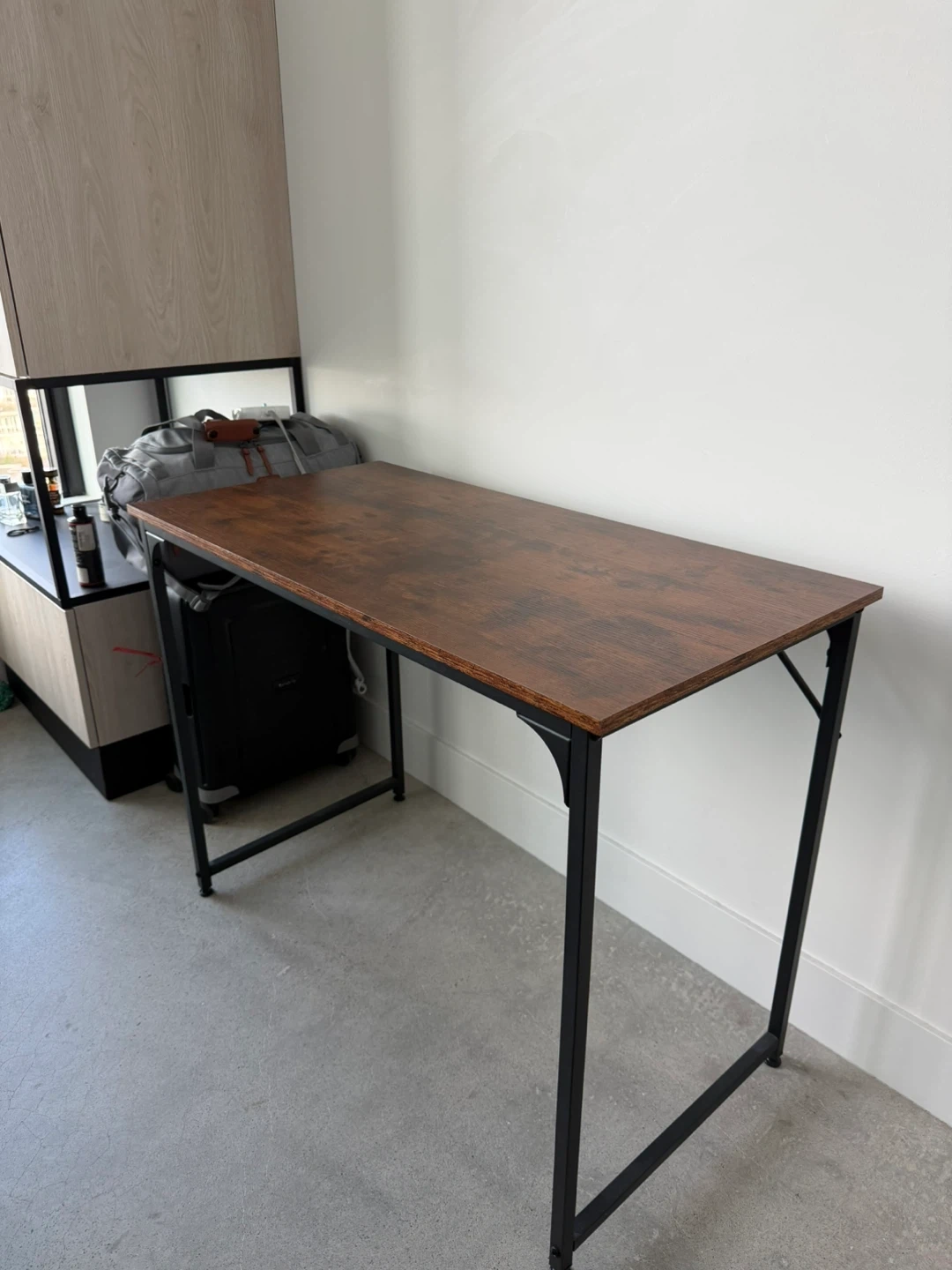 This CubiCubi computer desk is a 40-inch study and writing table. It features a black metal frame and a modern black finish. Please see the last image for dimensions.