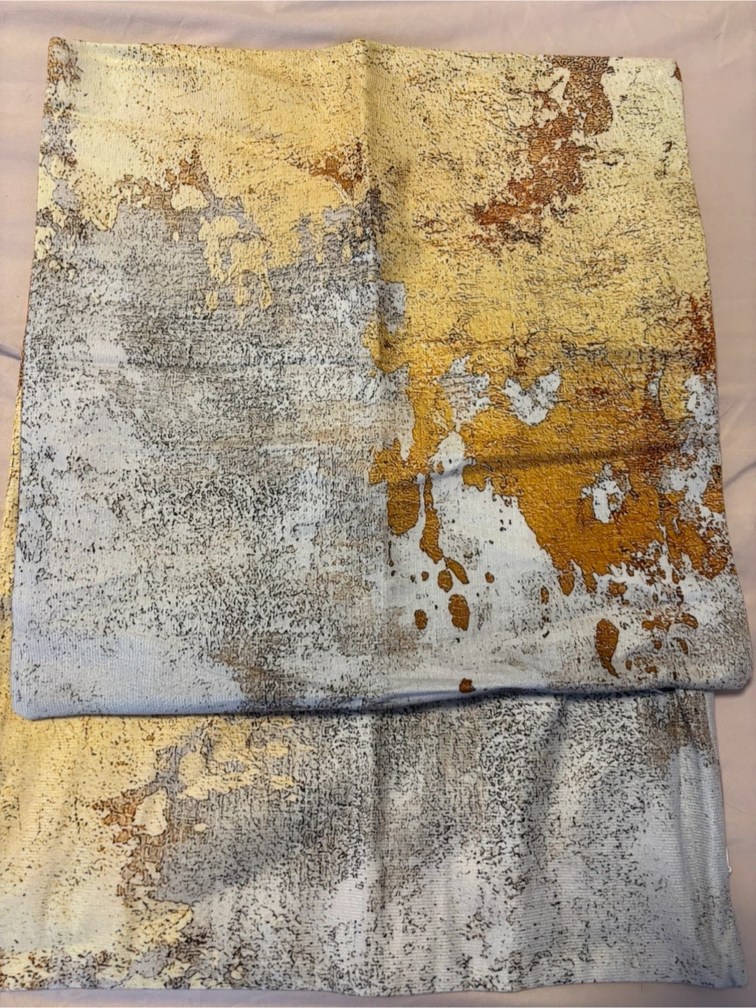 Two decorative throw pillow covers. Features a textured abstract design with gold, white, and grey tones.