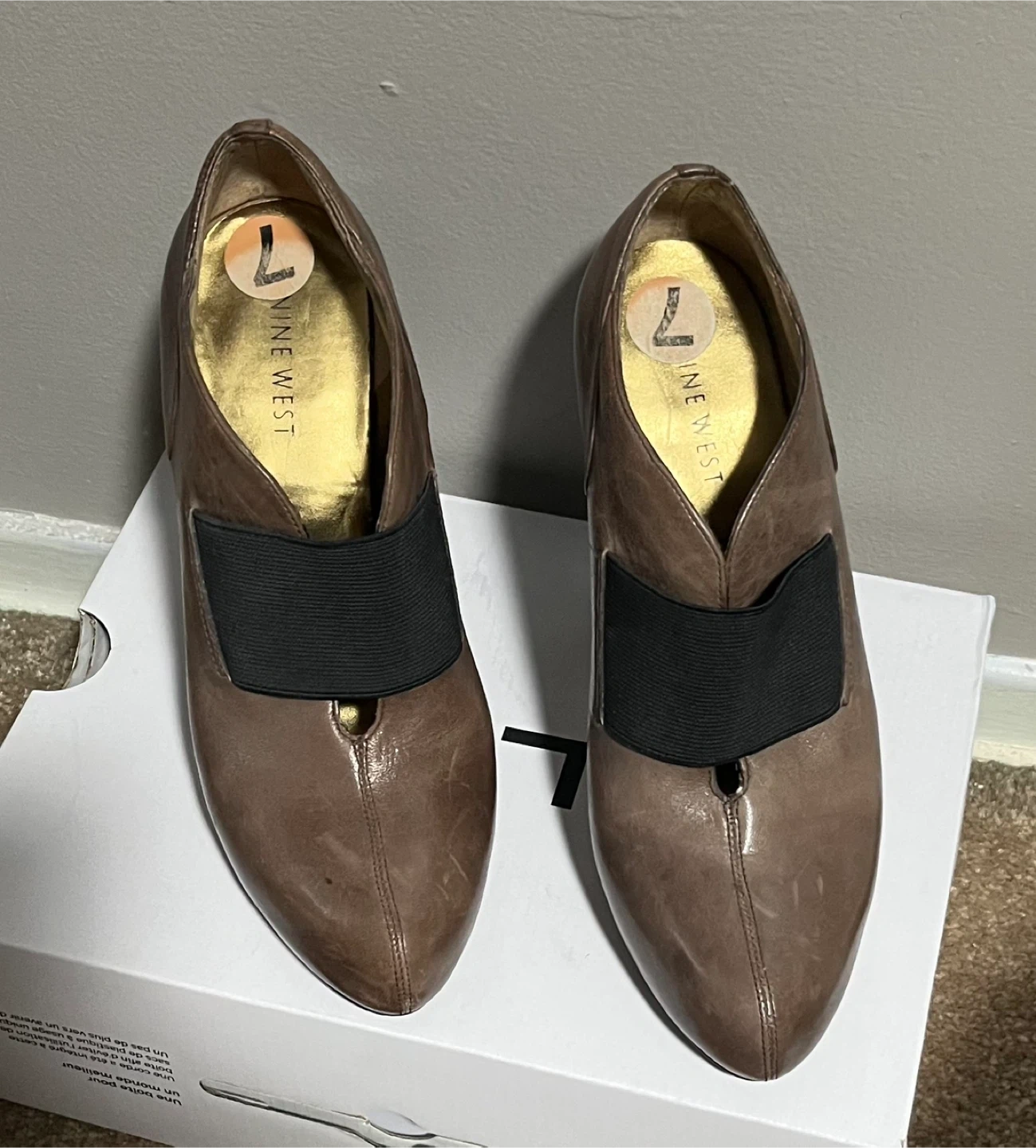 Selling a pair of Nine West heels in a lovely brown leather! They are a size 7 and feature a unique design with a black elastic strap. Perfect for dressing up or adding a touch of sophistication to your outfit